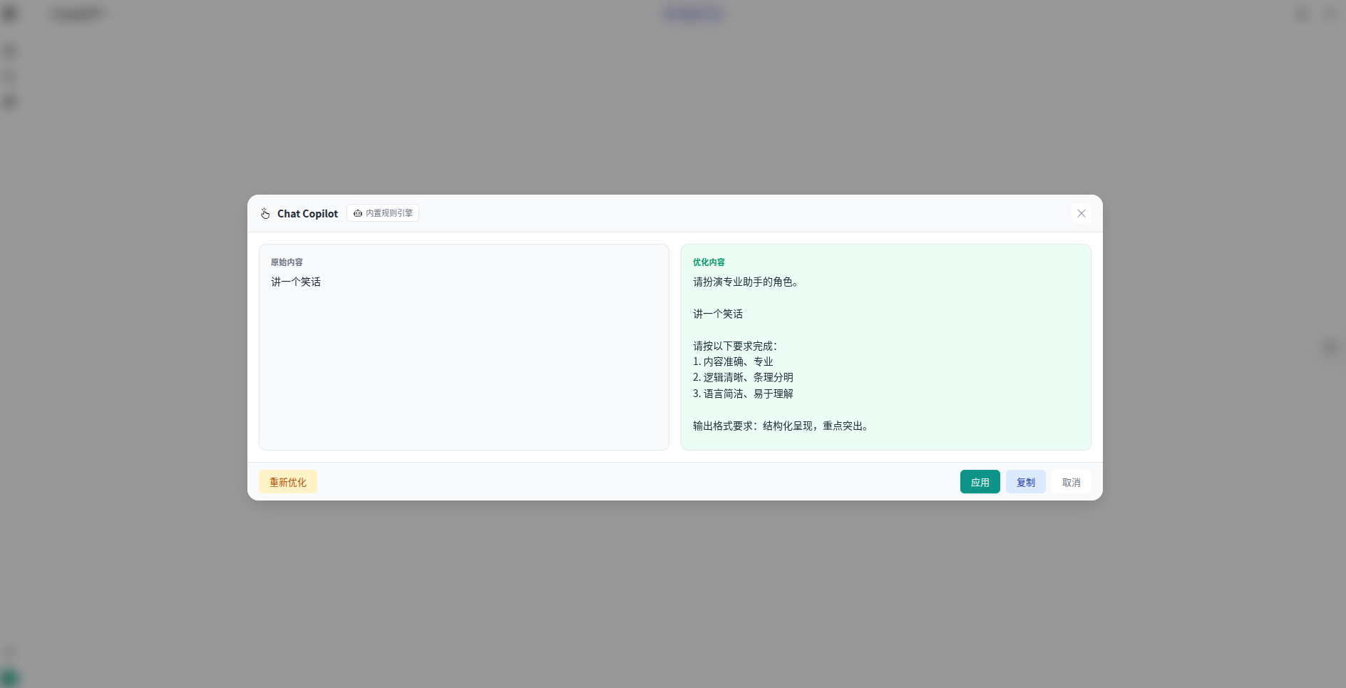 Chat Copilot 就是为了解决这个问题 —— 它会在你发送提示之前,帮你把提示词优化一下,让回答质量更高。