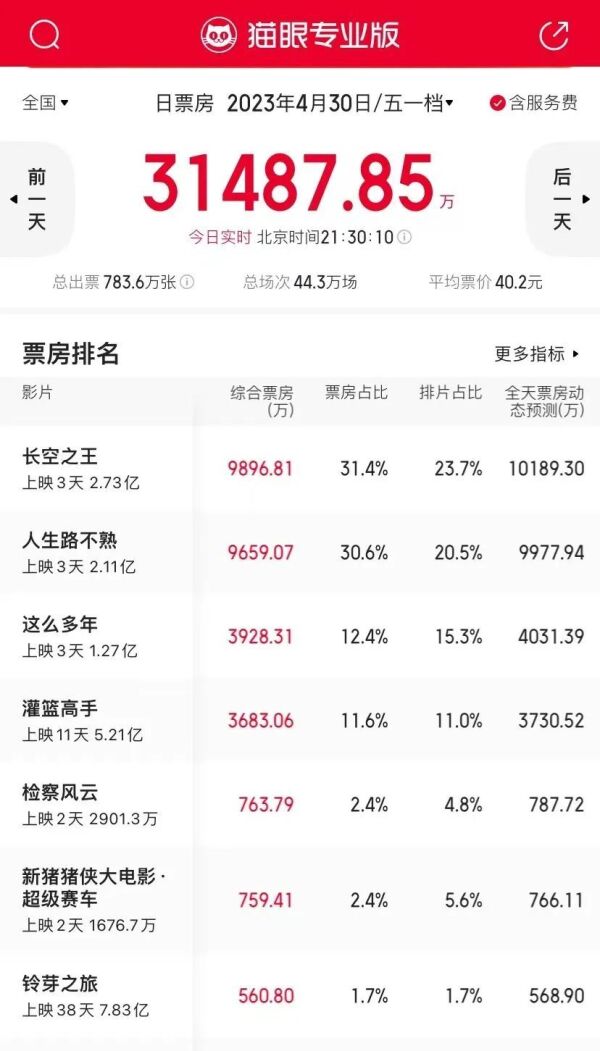 猫眼专业版显示,截至4月30日21时许,日票房3.1亿元,档期票房已累计约7.7亿元。其中《长空之王》领跑,《人生路不熟》《这么多年》紧随其后。