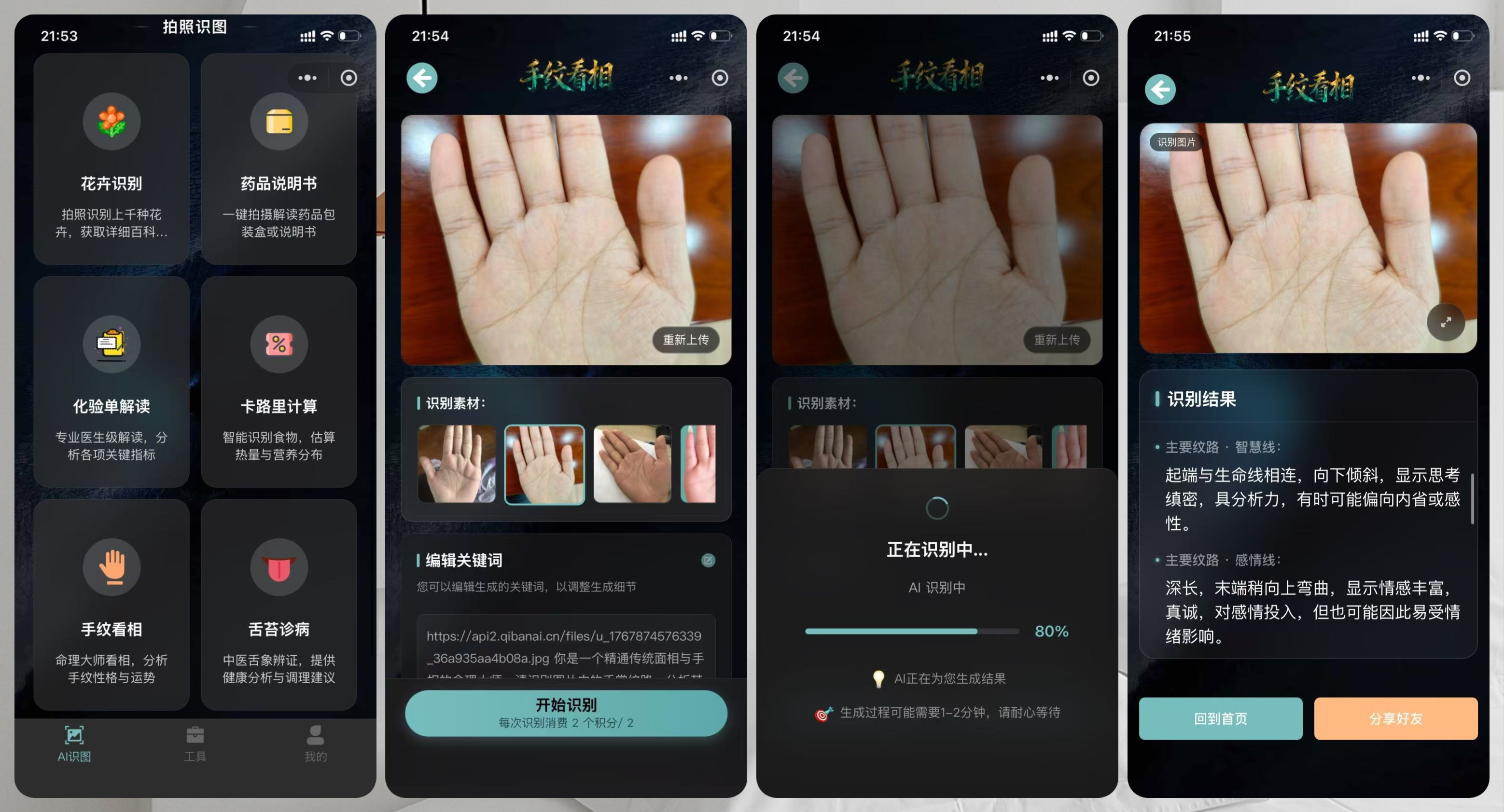 AI 手纹看相,之前奇伴识图里面一个模块,没想到玩的人这么多,之前有段时间模型不支持下线,最近重构重新上线了,大家可以尝尝鲜 只要拍一张手掌照,AI 就能“读懂”你的一生? 我用奇伴识图,体验了一次 AI 手纹看相 你有没有发现, 很多人都会在不经意间看看自己的手。 生命线长不长 感情线乱不乱 事业线到底有没有 过去想看手相, 要么找师傅,要么翻书,对着示意图研究半天, 最后往往还是一头雾水。 直到最近,我尝试了一种新的方式: 用 AI ,看手纹。 拍一张手掌照,AI 开始分析 整个过程,其实非常简单: [ol]打开 奇伴识图 对着手掌拍一张清晰的照片 上传图片 等待几秒 [/ol] 系统就会自动识别手掌轮廓、纹路走向、深浅与分布情况。 不需要你懂手相, 也不需要手动标注任何线条。 AI 自己能看懂。 喜欢尝鲜的可以玩玩 AI, 手纹, 看相