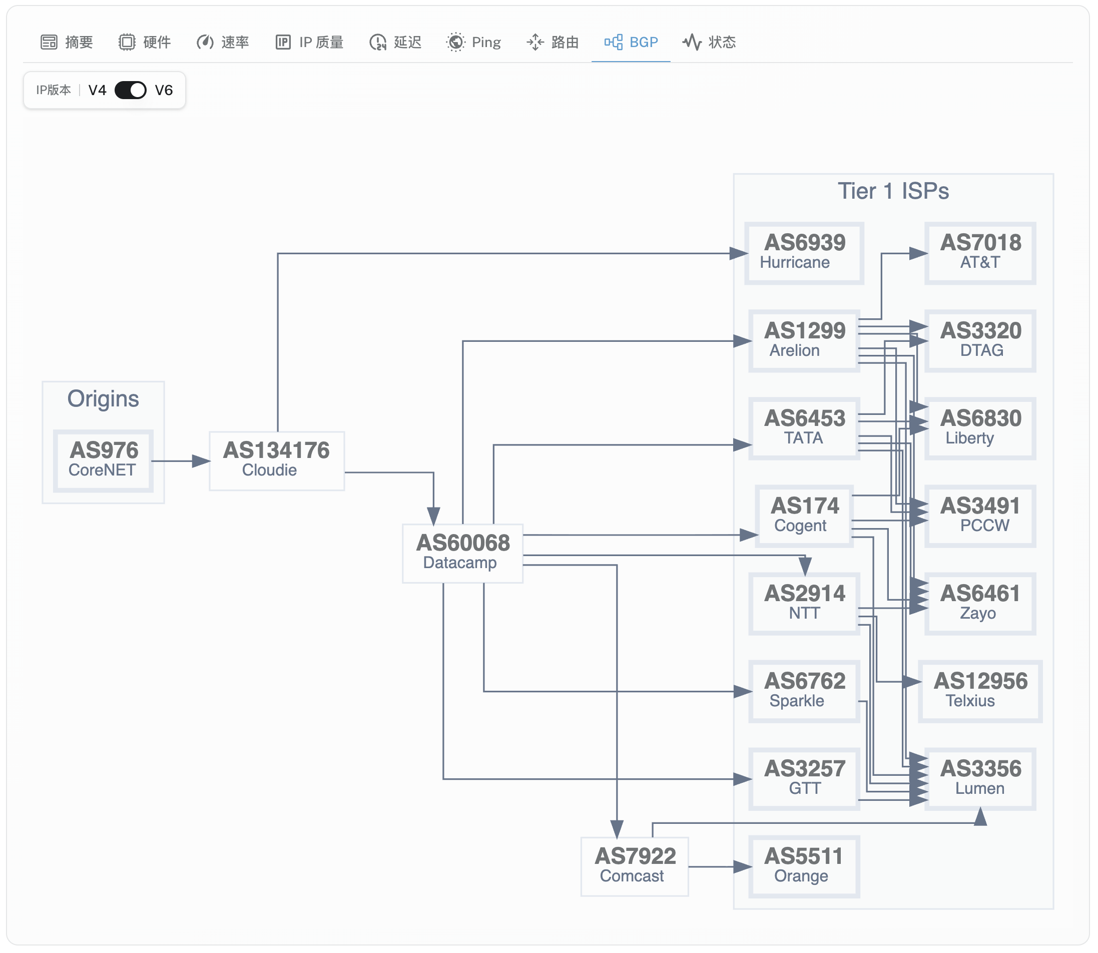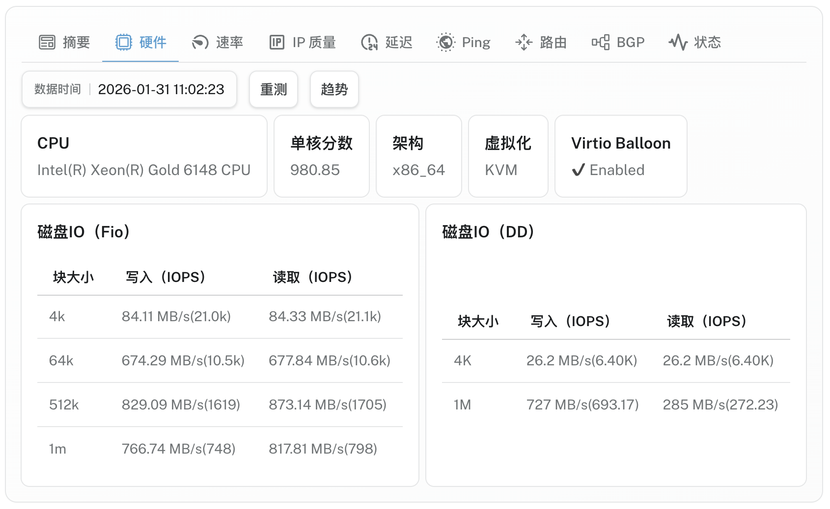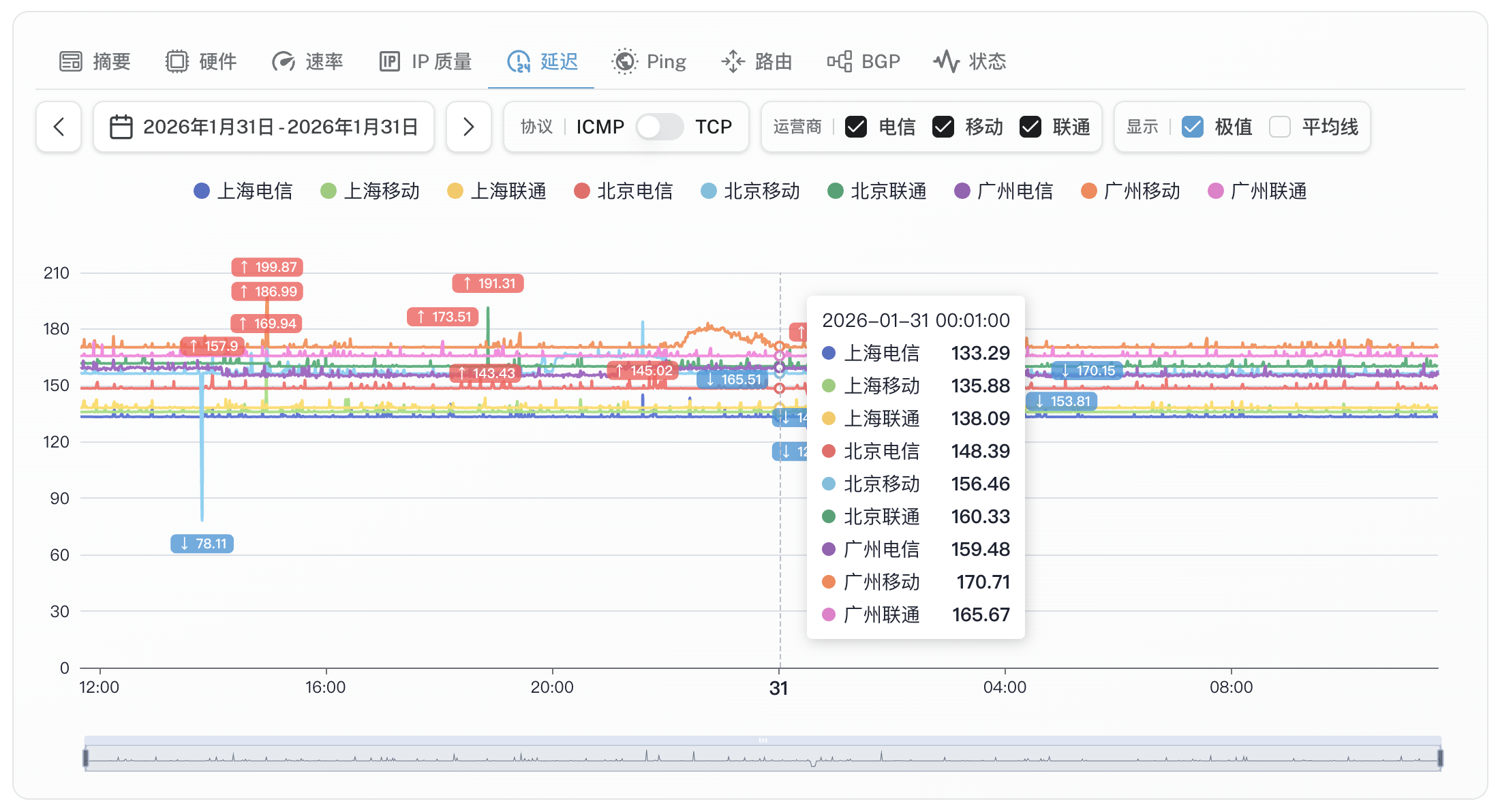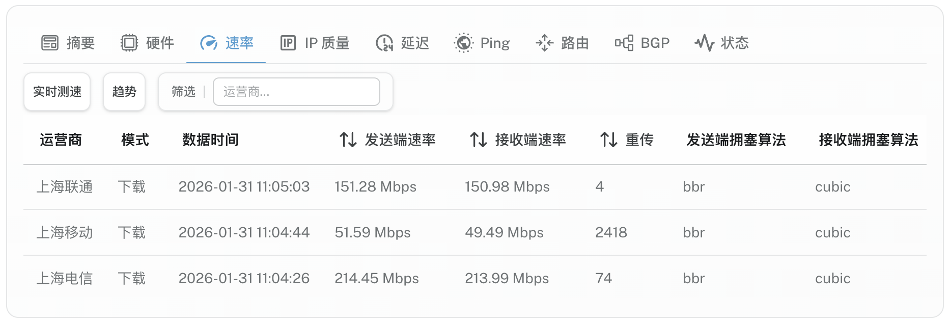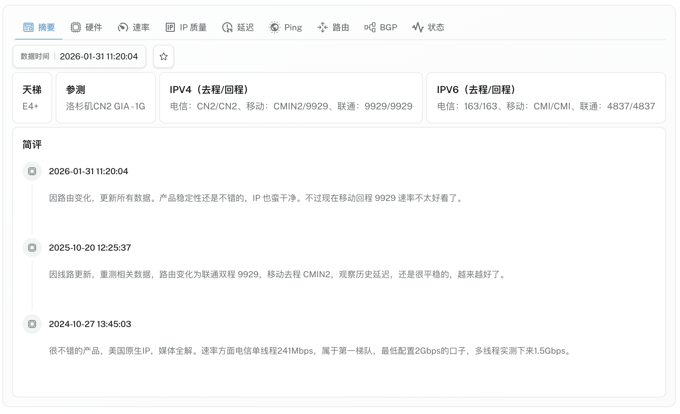 规格: 摘要: 硬件: 速率: IPv4 质量: IPv6 质量: ICMP 延迟: TCP 延迟: BGP IPv4: BGP IPv6: 如对该产品感兴趣,想要持续关注其实时与历史数据表现,欢迎访问我们的站点进行长期跟踪。