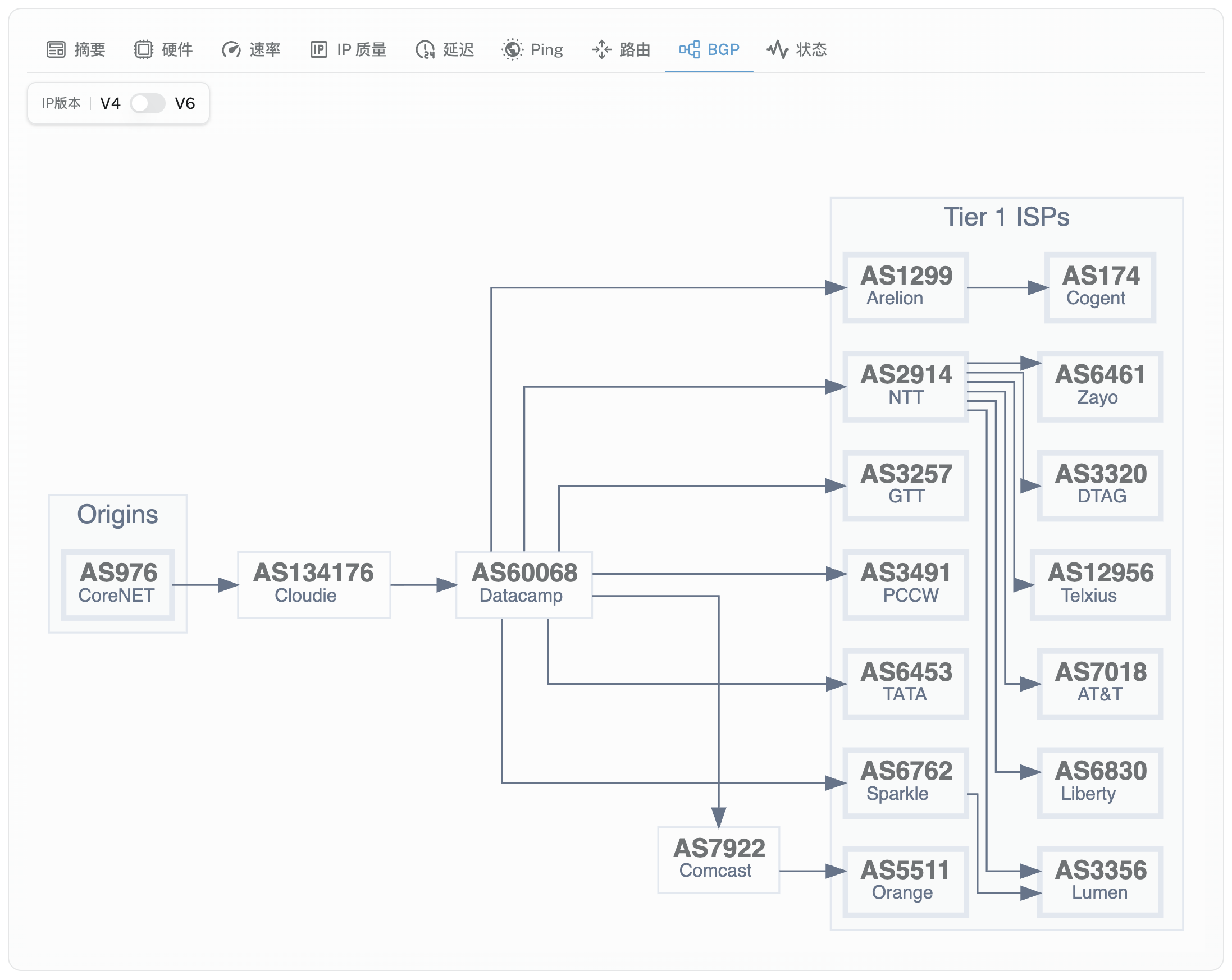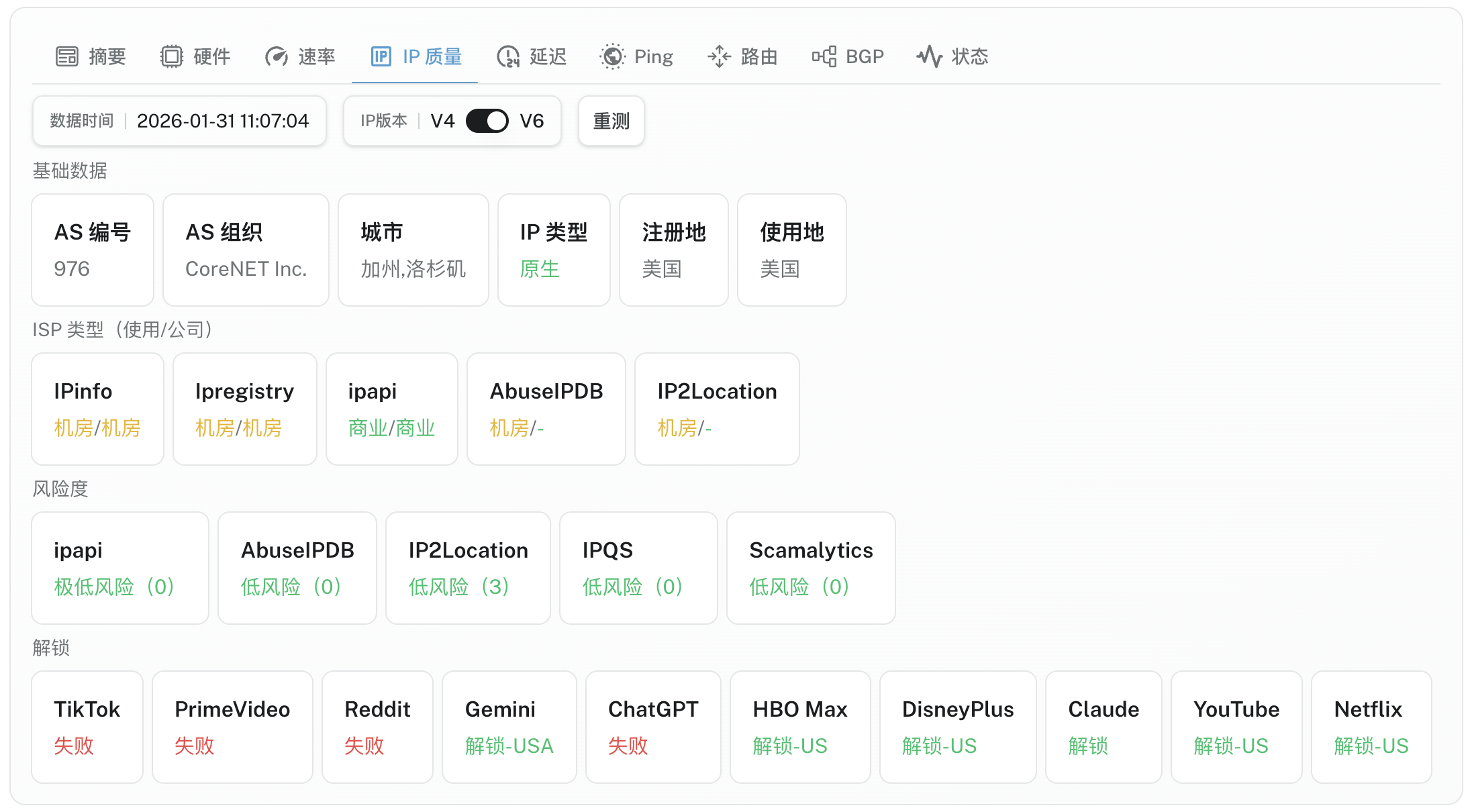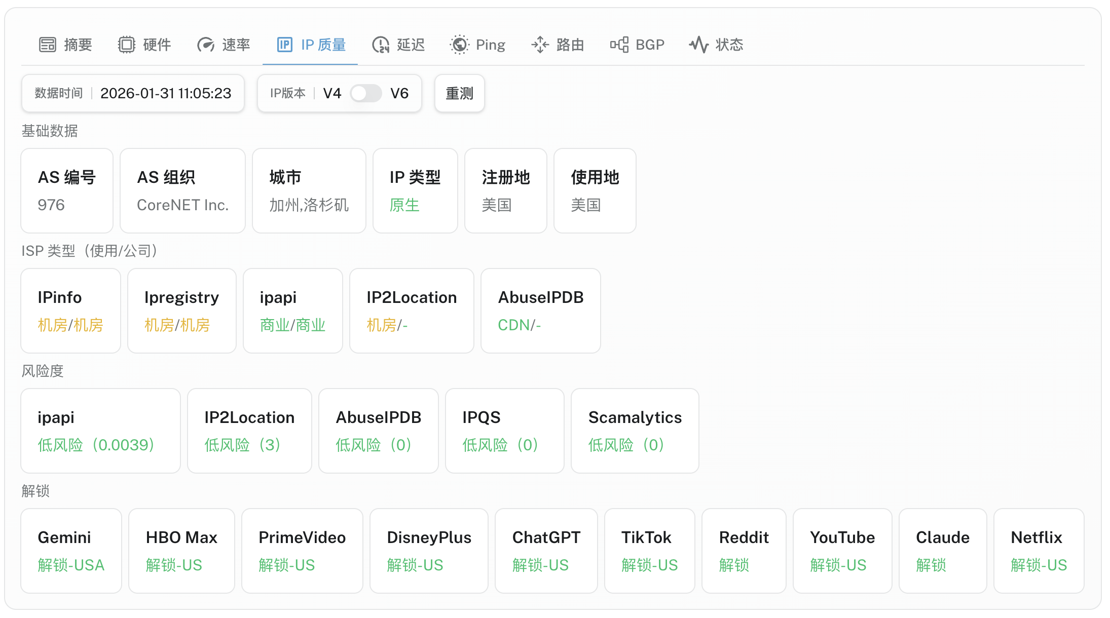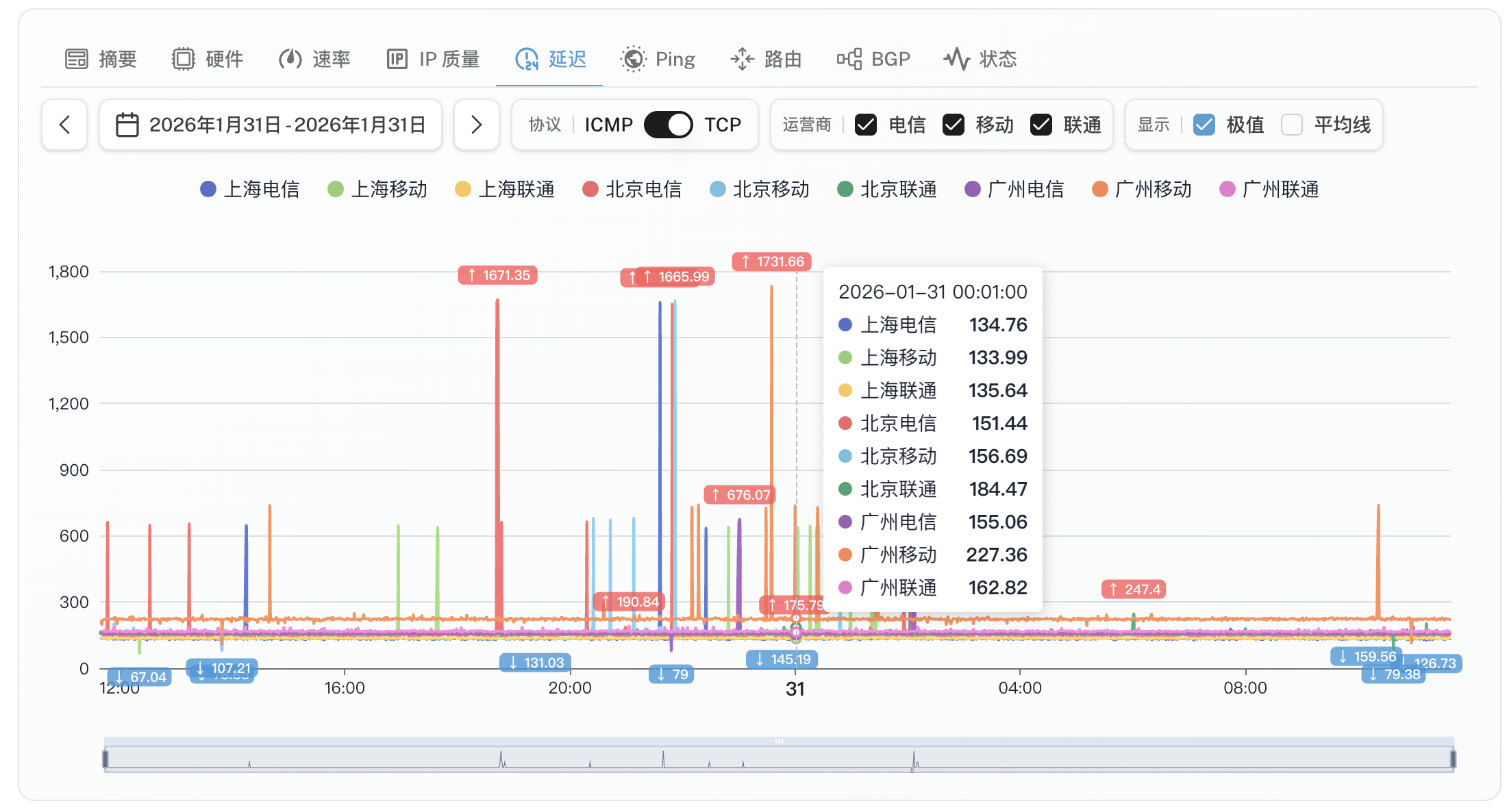 规格: 摘要: 硬件: 速率: IPv4 质量: IPv6 质量: ICMP 延迟: TCP 延迟: BGP IPv4: BGP IPv6: 如对该产品感兴趣,想要持续关注其实时与历史数据表现,欢迎访问我们的站点进行长期跟踪。