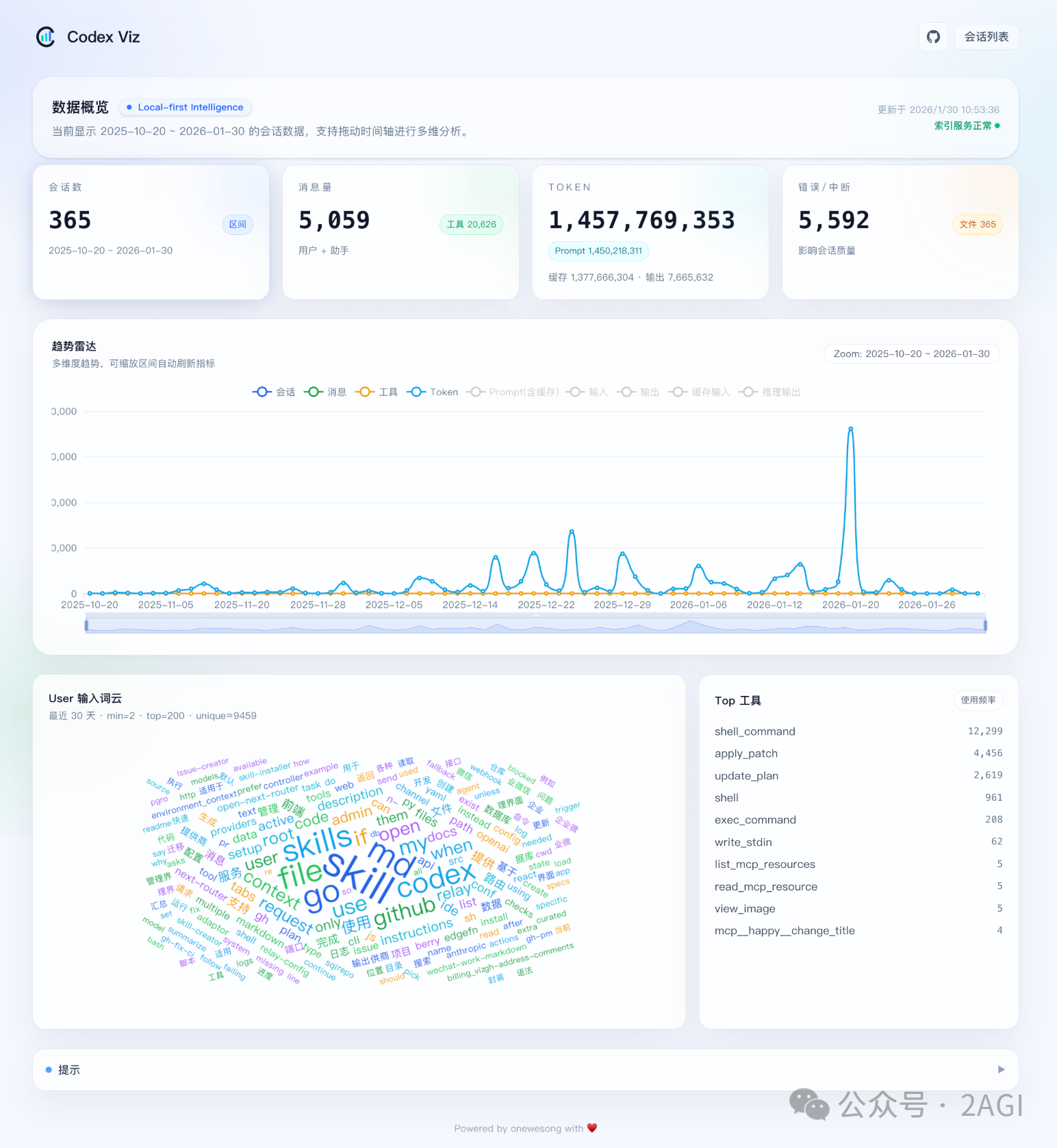 现在做需求已经不是先想代码怎么写,而是先想怎么 prompt 了 预估工时也不再是代码编写的时间,而是 Agent 多久能跑完,代码的生产速度≈Token 的生成速度 gpt-5.2 真是一个靠谱的伙伴,基本上每次 prompt 都能拿到预期的结果 BTW, codex-viz 是我 vibe coding 的一个统计 codex 本地用量的工具,有需要的可以自取 https://github.com/onewesong/codex-viz