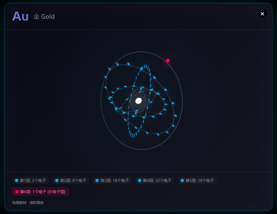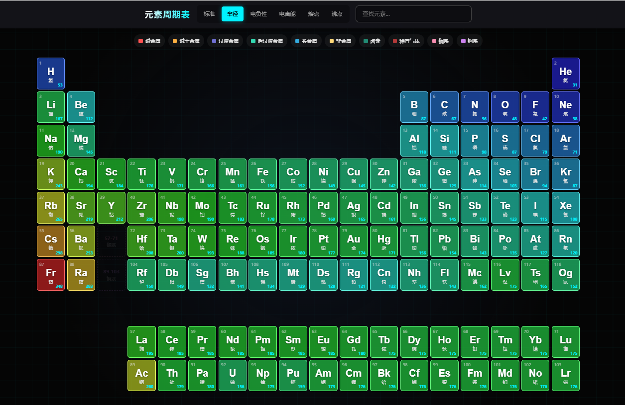 大家好,最近看到一个很有意思的视频灵感,一时手痒,用纯原生的 HTML/CSS/JS 写了一个赛博朋克风格的交互式元素周期表。 项目没有任何构建依赖,开箱即用。主打就是一个视觉效果和交互体验,包含 3D 原子结构模拟、多维度热力图等功能。 发出来给 V 友们图一乐,顺便求个 Star 🌟,也欢迎大家提提建议! 🔗 传送门 在线体验 (Live Demo): https://seanwong17.github.io/Future-Style-Periodic-Table/GitHub 源码: https://github.com/SeanWong17/Future-Style-Periodic-Table ✨ 主要玩法与特性 这个项目虽然只是个前端页面,但把化学书上的东西做得稍微酷炫了一点: [ol]沉浸式视觉:深色赛博朋克风,配合霓虹光效和玻璃拟态( Glassmorphism ),比传统的格子表耐看一些。**3D 原子结构 (CSS)**:点击任意元素进入详情页,可以看到基于 CSS 3D Transforms (transform-style: preserve-3d) 渲染的原子模型。支持鼠标拖拽旋转,可以看到电子在轨道上跑。多维度数据可视化:支持一键切换热力图模式。想看原子半径、电负性、熔沸点的分布?点击按钮,周期表会自动变成热力图色谱。数据全:收录了 118 种元素,包含电子排布、同位素、化合价等详细数据。双语支持:做了中英文切换,方便查阅。 [/ol] 📸 截图预览 周期表主界面 (建议配合深色模式食用) 热力图模式 (电负性分布) 3D 原子模型交互 赛博朋克, 元素周期表, 交互式