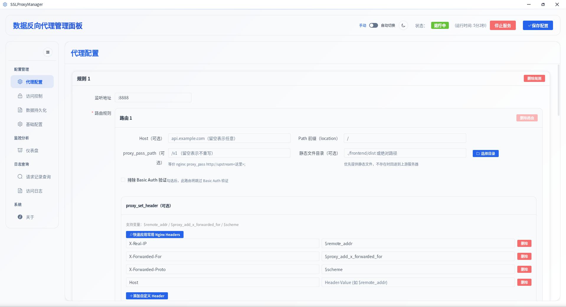 一个桌面代理管理工具,提供现代化的基于 Web 的管理界面,用于管理 HTTP/HTTPS 、WebSocket 和 Stream ( TCP/UDP )反向代理。
