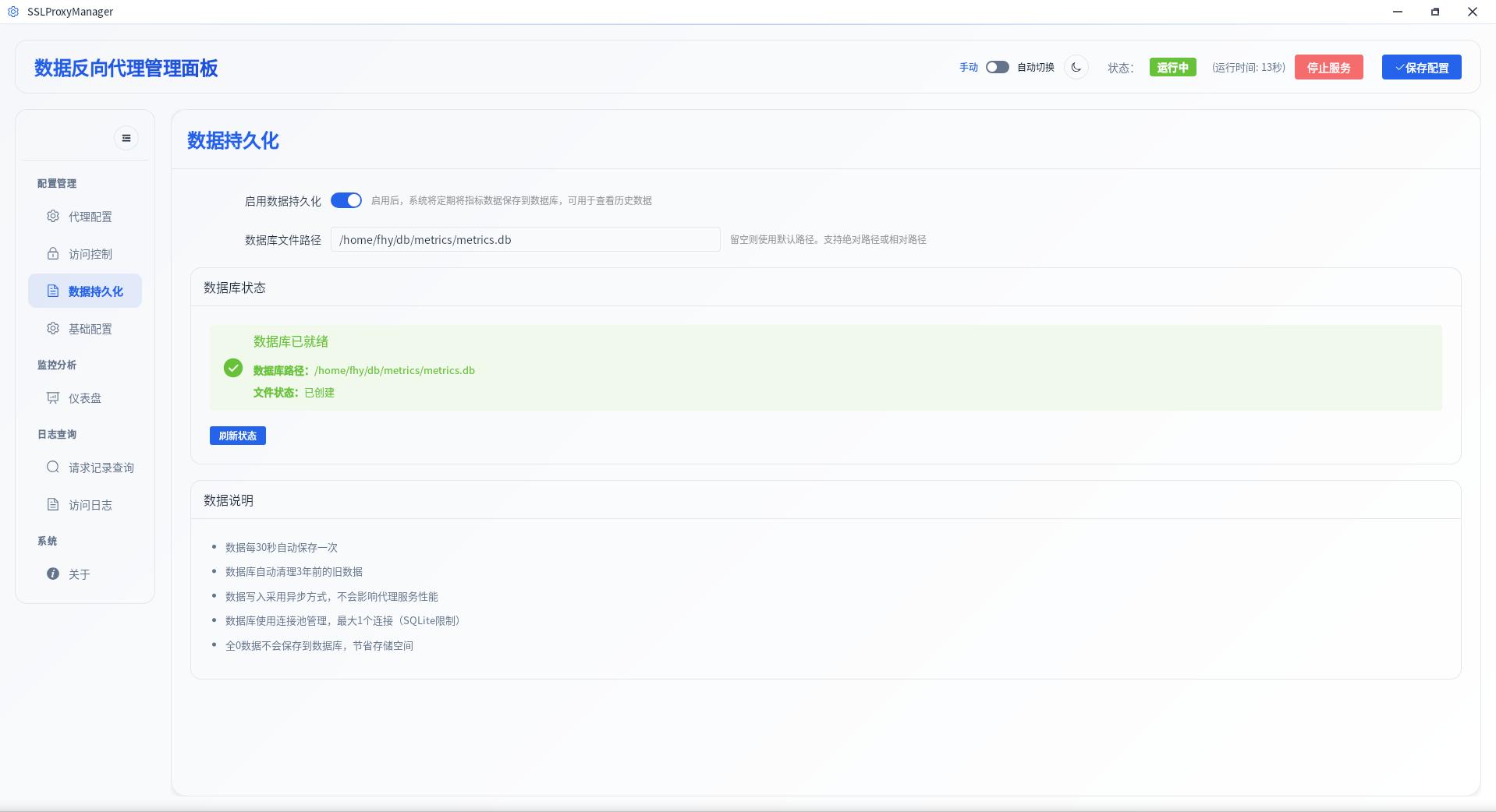 A: 开发模式下,如果项目根目录存在 config.toml,则优先读取。生产模式( Linux )下,默认位置是 ~/.config/SSLProxyManager/config.toml。