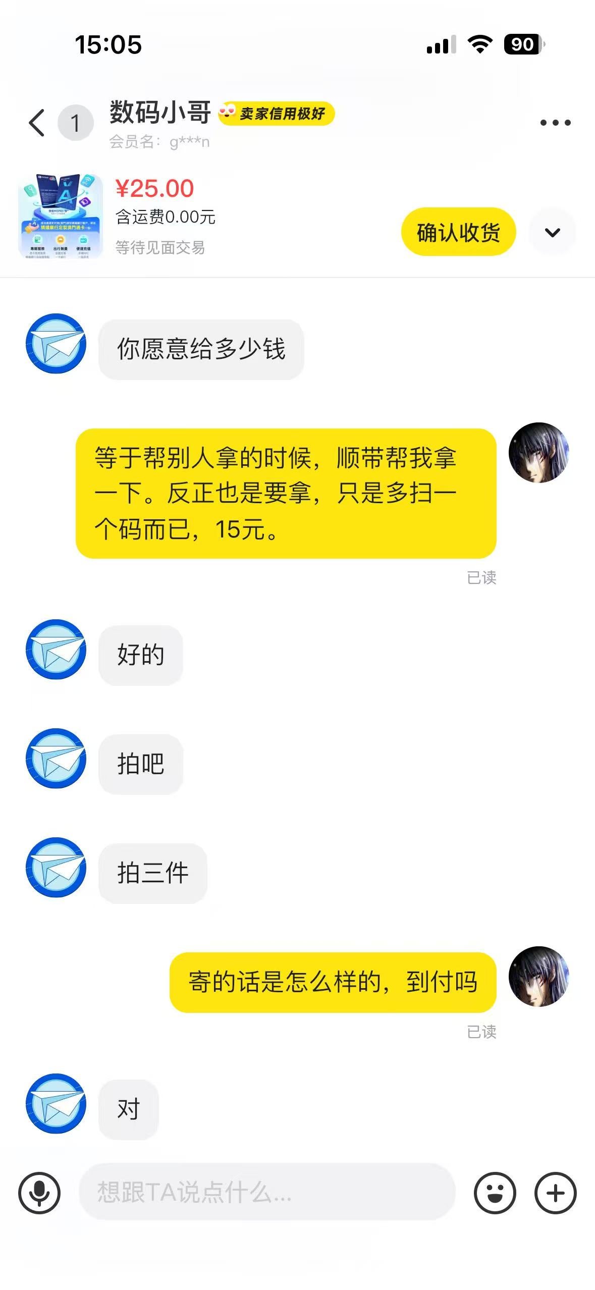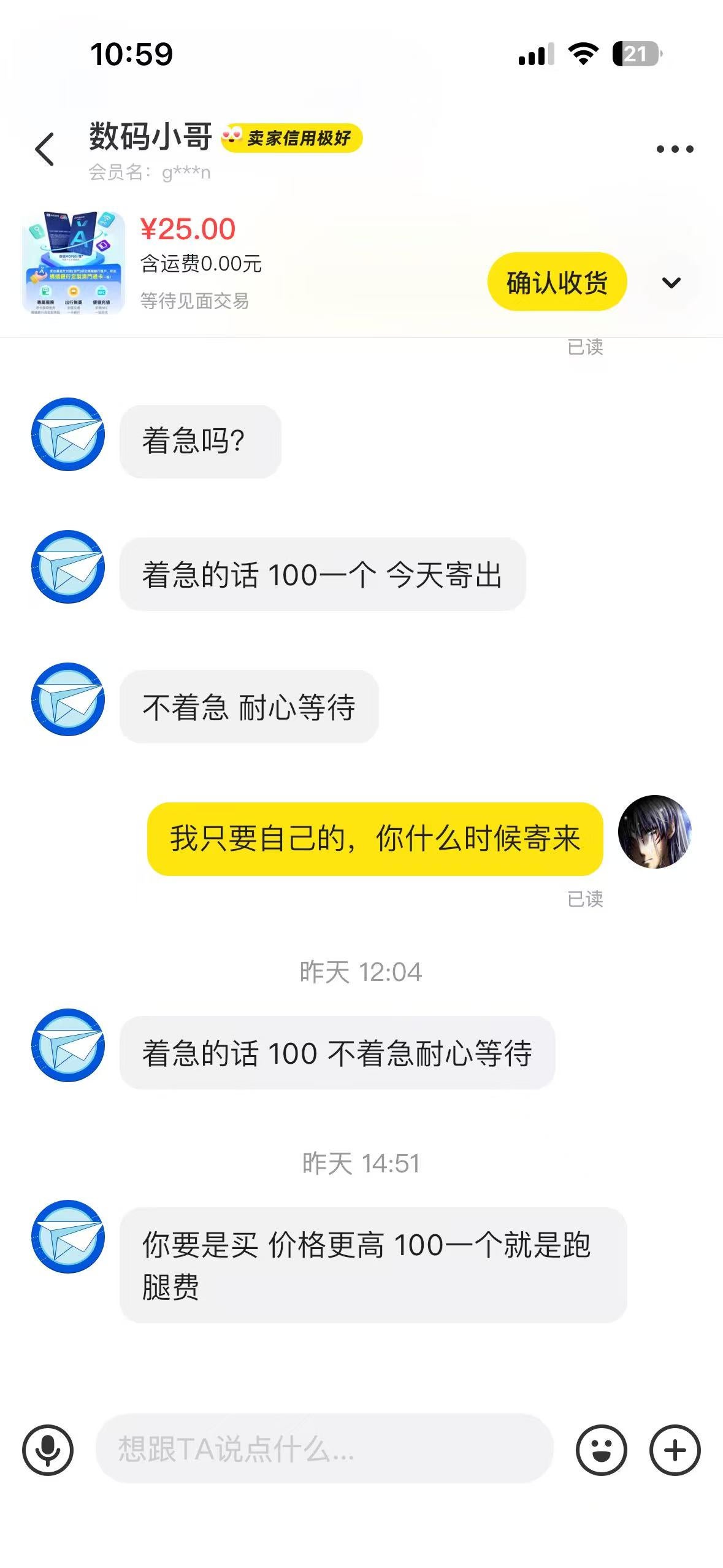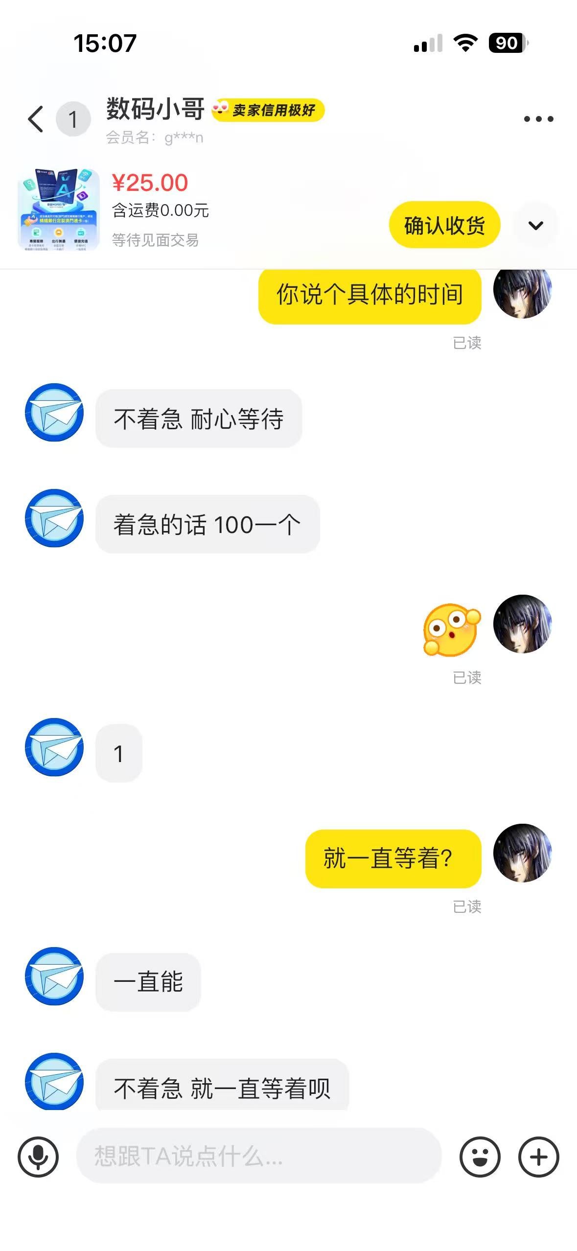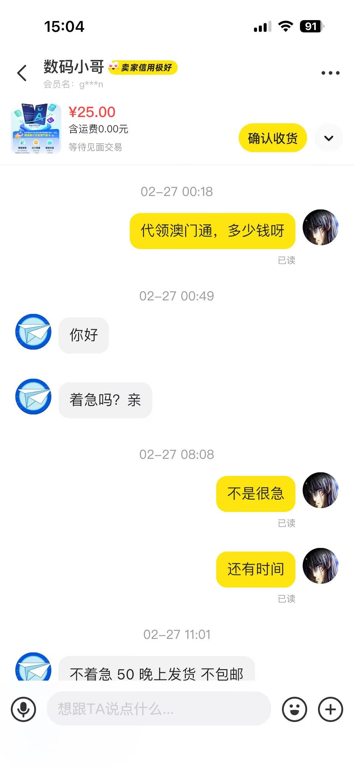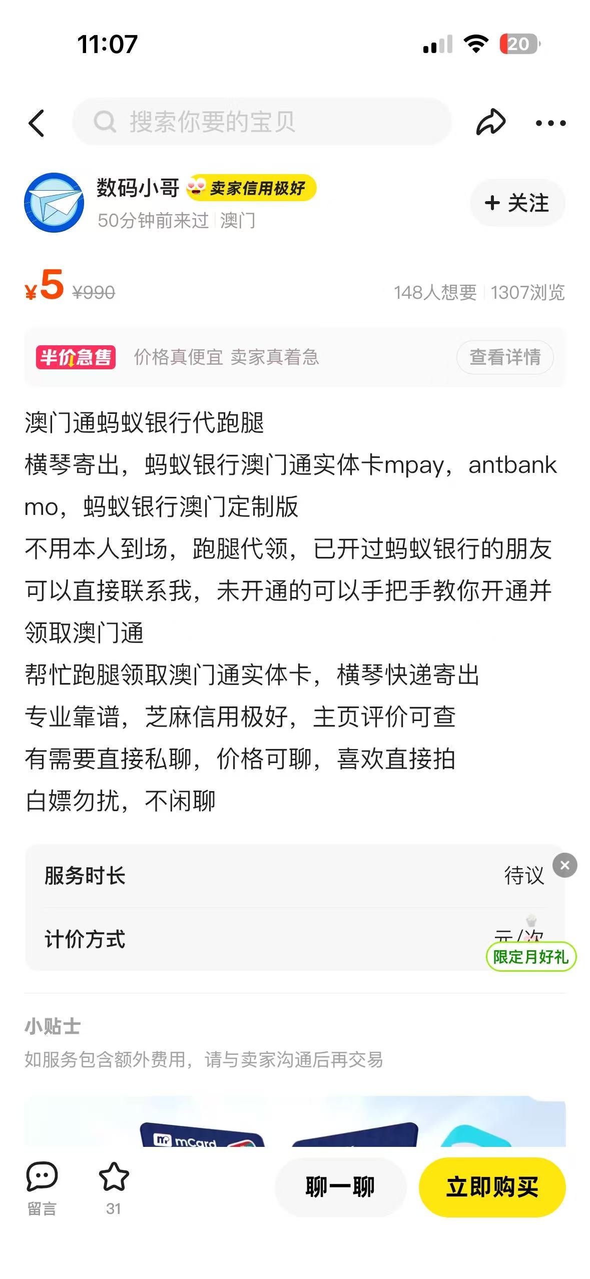 前几天到澳门开了蚂蚁银行,忘了去领取澳门通。在闲鱼里看到有代跑腿取货了,就联系了店家帮忙取。商量好25元跑腿费,结果商家取了货后一直敷衍不给,或者要求100元一张卖给我。这简直就是诈骗,骗钱骗货。投诉到闲鱼客服,没有一点用。打电话客服全是敷衍话术。各位有什么方法可以举报成功,让他封店?