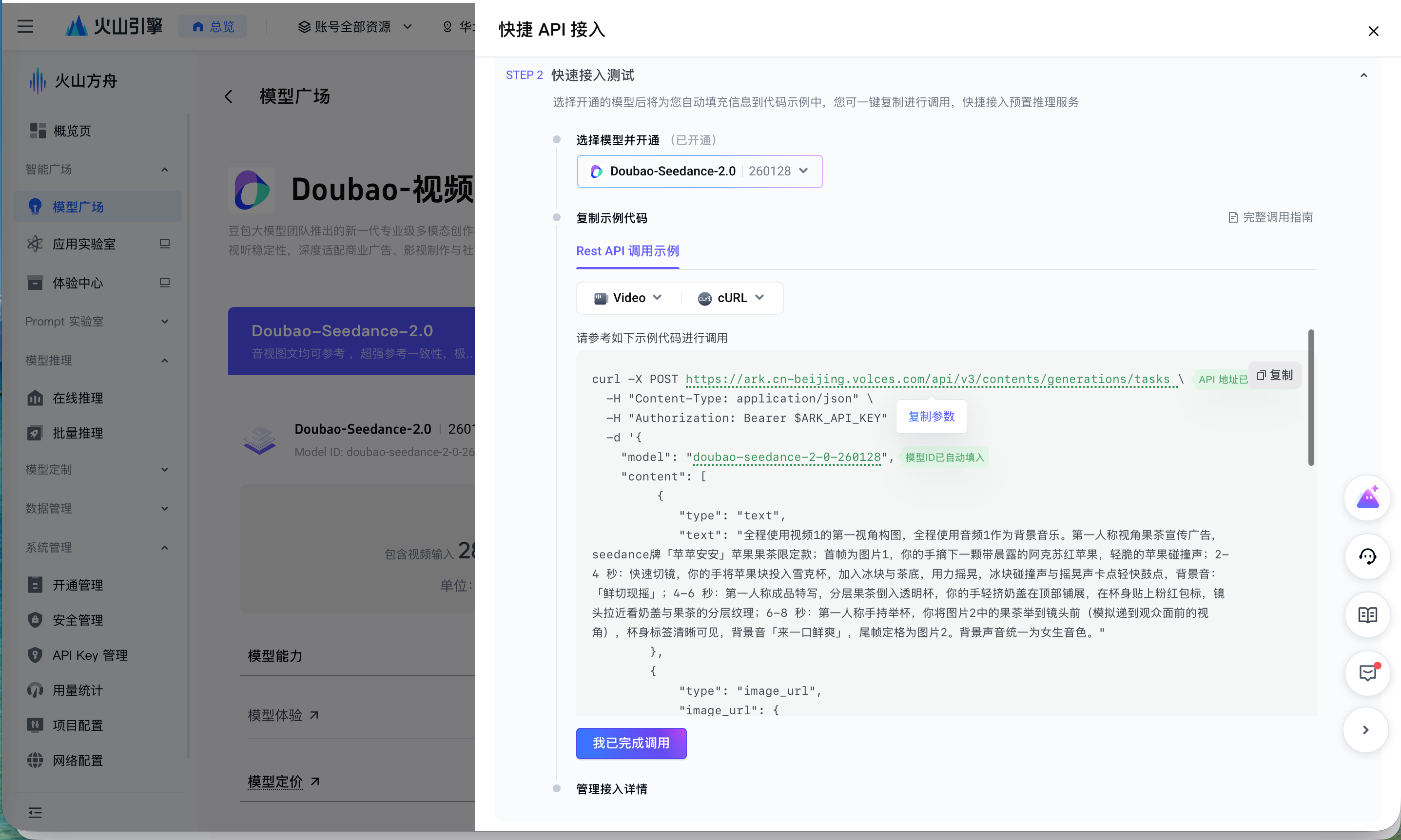 打开字节火山官方网站,找到 seedance 2.0 然后点击 API 如图