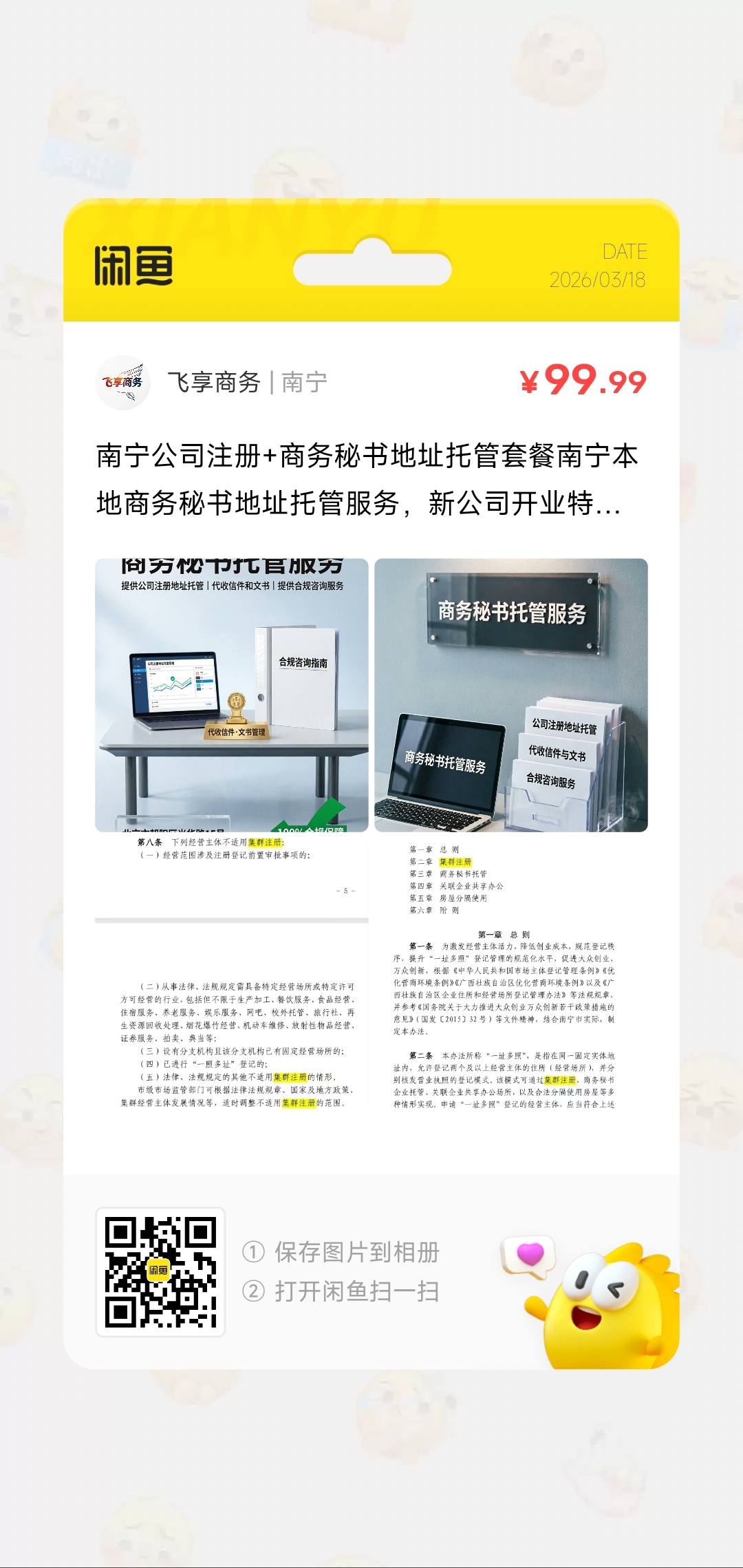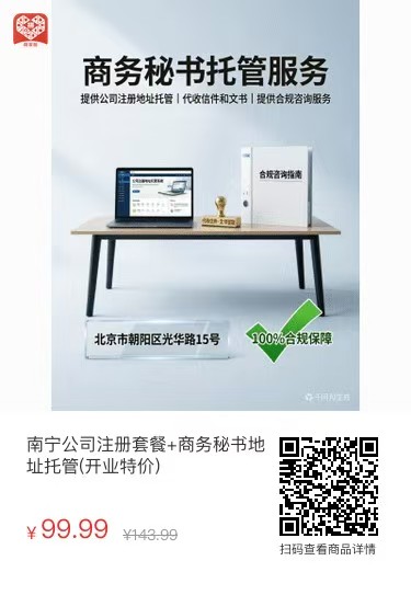 公司开业特价套餐:(提供1年商务秘书服务:公司地址托管、代收信件和法律文书、指导合规经营) + (企业公司注册登记) 仅须¥99.99 元