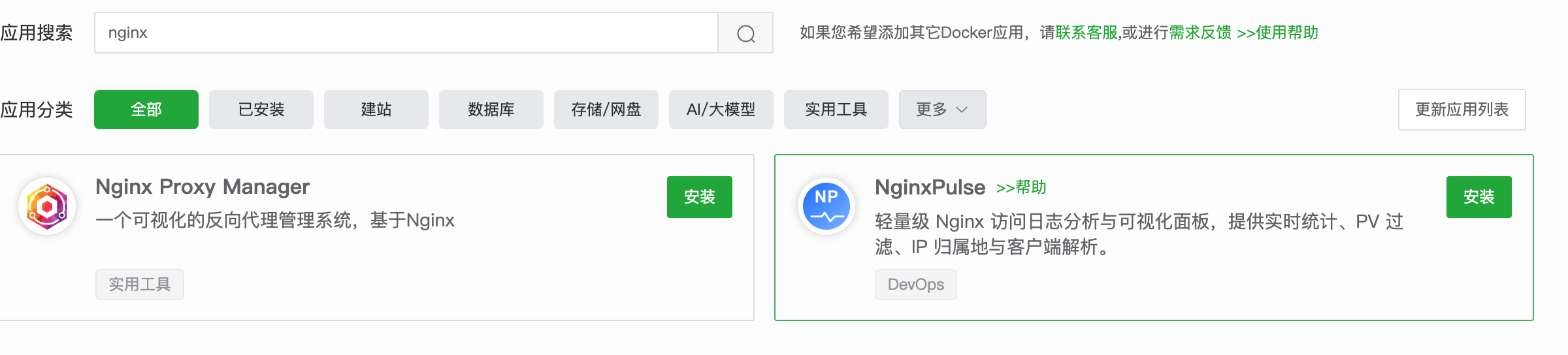 我的日志分析工具 nginxpulse,现已上架宝塔的 docker 商店。