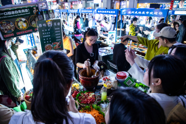 “味道很浓郁,甜度也合适。”顾客尝了一口后告诉潮新闻记者,随后她又拉着朋友跑到隔壁摊位排队买了两盒舂鸡脚,“我是东北人,我朋友是从新疆过来游玩的,没吃过这些,我们都想尝试一下。”