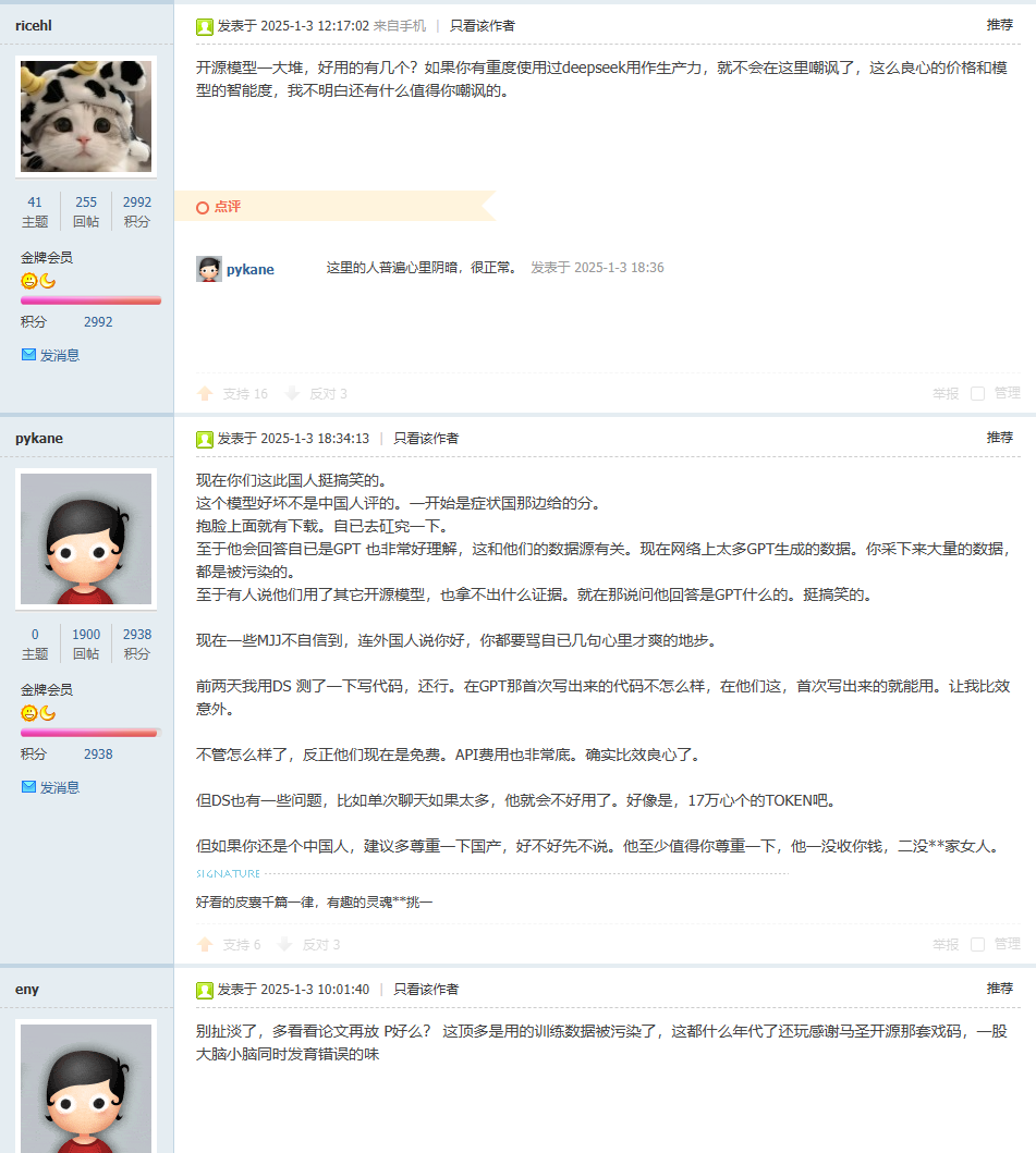 一年多前DS刚发布的时候我说DS偷,还有一堆硬洗。 唯一少说的就是不仅拿人家开源的,还蒸馏人家不开源的。 就是因为ds的这番操作,所以很多厂家大规模封禁中国来的账号,甚至用中文都要被BAN号。 被限制后几乎没什么大动作了吧?V4叫了这么久,在哪呢? 或许过阵子V4就要来了,这下要直接偷国内友商的数据了吧? 一年前那些硬洗的ZZ自己来看看。 https://lochost.232345.xyz/thread-1379678-1-1.html 一年后我再来,看看DS倒闭没有。 开源, 来了, 我说