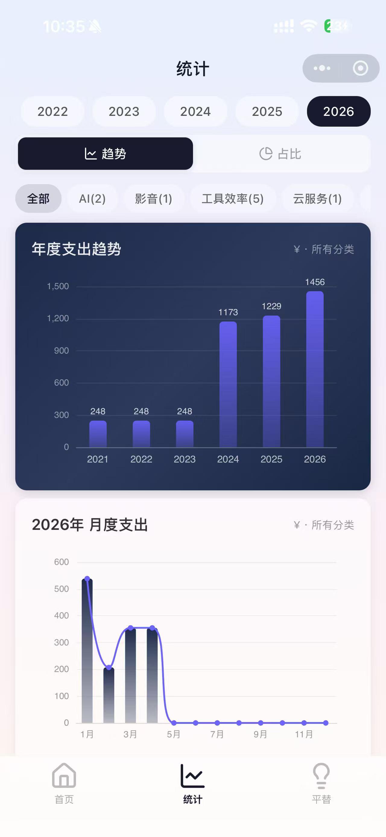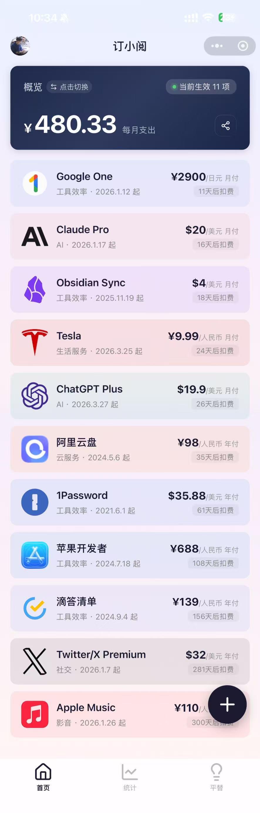开发自己的订阅工具一开始是为了解决目前市面上以有订阅软件不支持前 X 个月优惠的设置,比如我订阅了 Google One (为了用 Gemini ),前三个月是 950 日元(约 6.7 刀(,然后从第四个月开始才 2900 日元(合 20 刀)这种的。