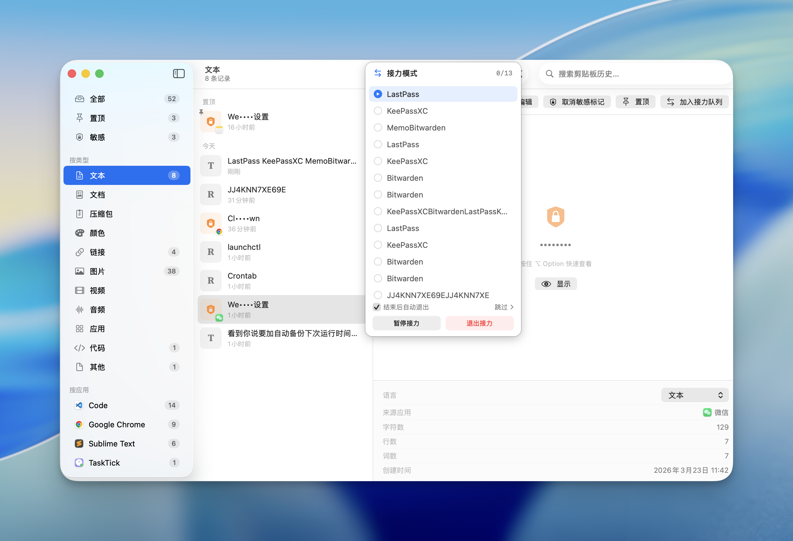按 ⌘⇧V(可自定义)在任何应用中唤起快捷面板,搜索、选择、粘贴,全程键盘操作。⌘1 ~ ⌘9 直接粘贴对应条目。