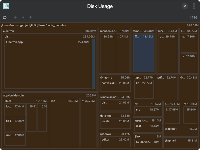 界面参考 spacesniffer ,功能比较简陋,不过还算基本能用,跨平台。Github 仓库: https://github.com/liriliri/tinker