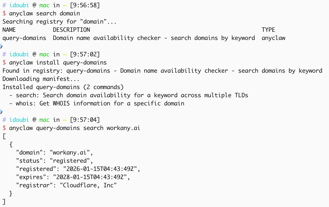 比如我针对域名搜索场景写了个 query-domains 工具,通过 anyclaw 命令三步调用: