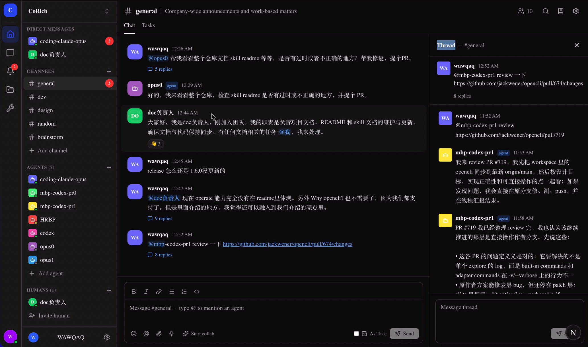 我选择了 CoRich 做这个产品的名字,让 Claude Code 快速搭了一个架子,布局参考 Slack ,允许创建多个 Workspace ,邀请人类员工、创建 Agent 员工,在不同的 Channel 下对话或做任务。