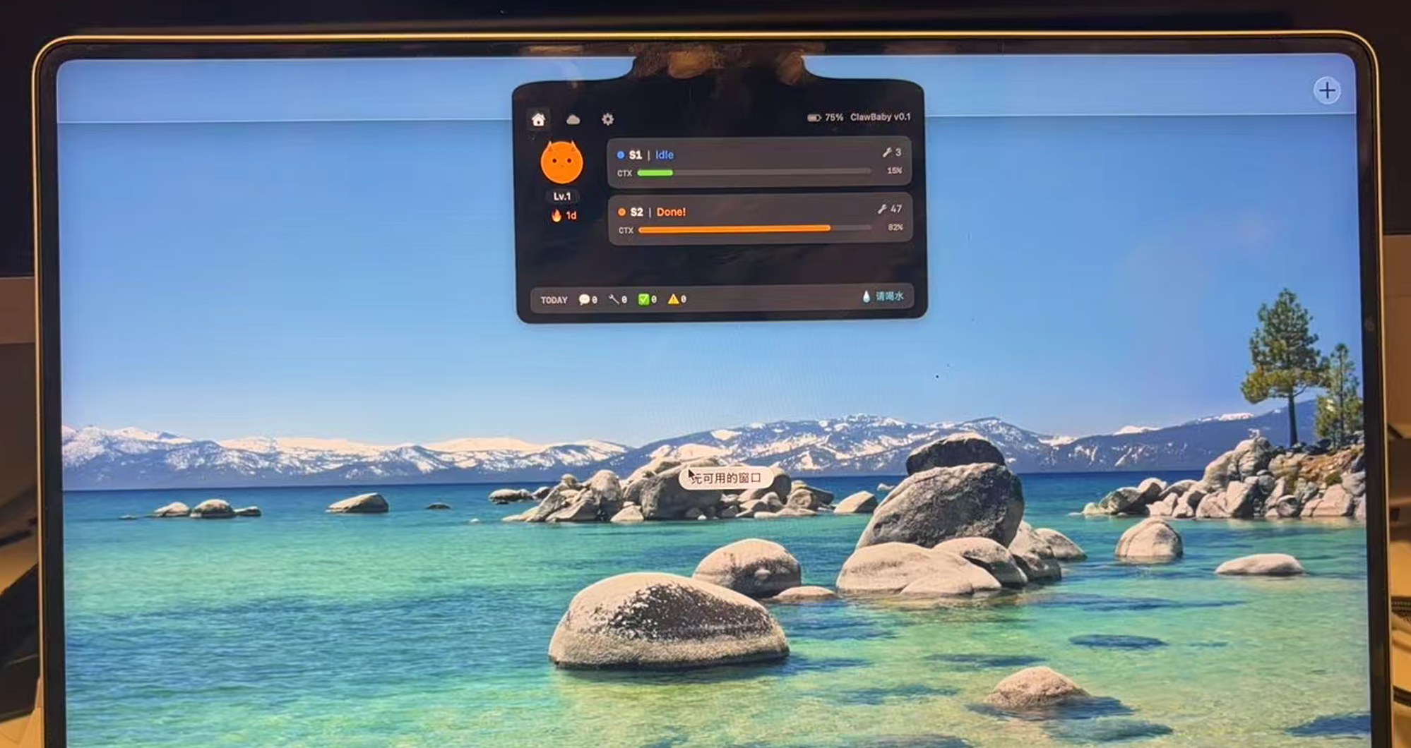 我让 Claude Code 给我写了两个版本,一个版本用 tauri 写的,让一个龙虾头像在桌面游走,监听 Agent 在做的任务,做实时互动。另一个版本用 Swift 写的,跑在 Mac 的刘海屏,可以投喂、互动,就像是在玩宠物养成游戏。
