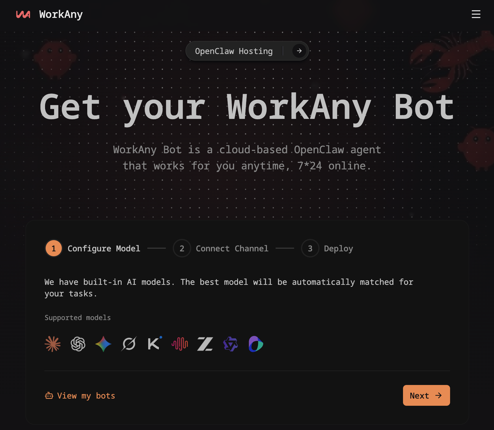 我花了一个周末的时间,发布了 WorkAny Bot ,提供 OpenClaw 云端托管服务。