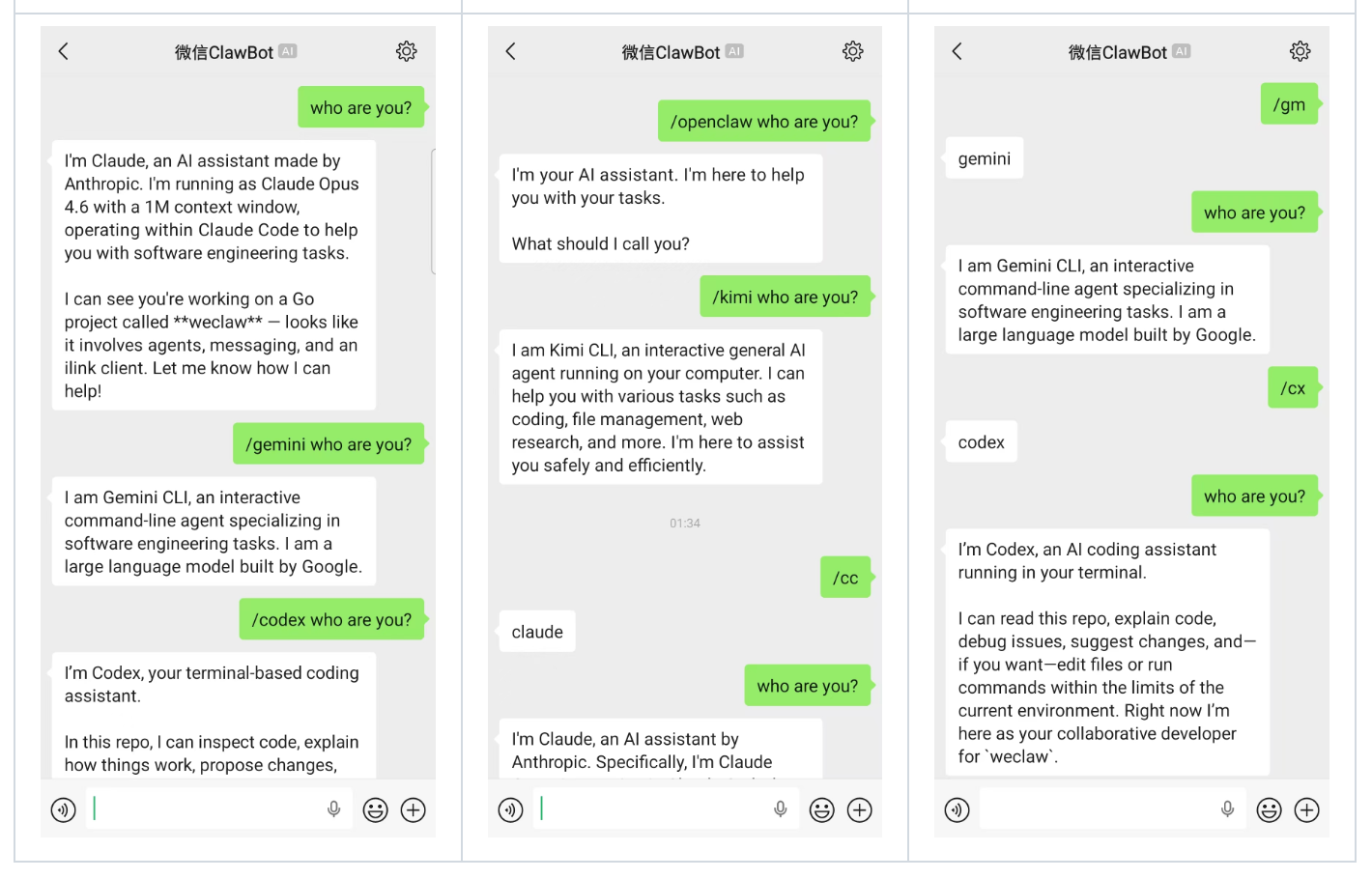 用户可以在微信 ClawBot 通过自定义指令切换 Agent 对话,可以把消息同时发给多个 Agent 。