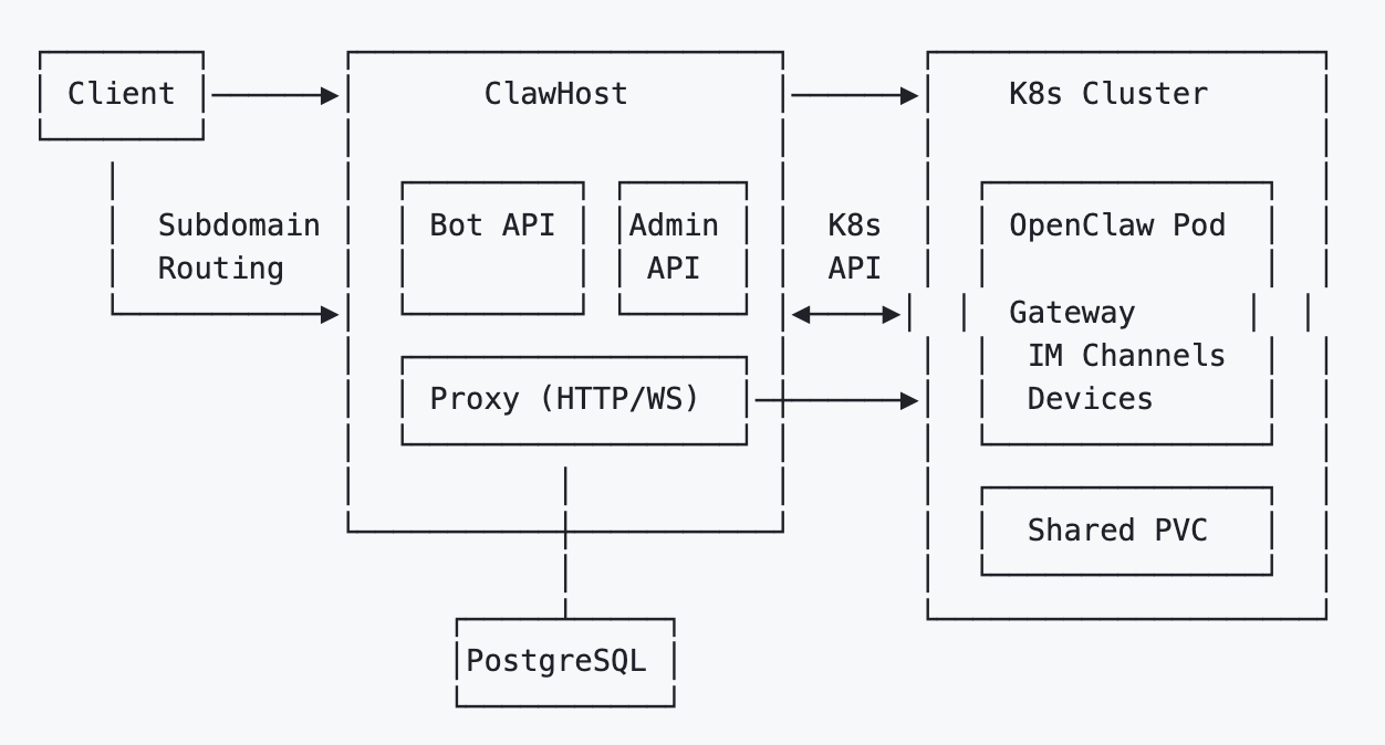 ClawHost 提供一个简单的管理面板,管理员创建 App 和 Bot ,对外提供 Restful API ,第三方 App 通过 API 创建 Bot 和管理 Bot 内配置。