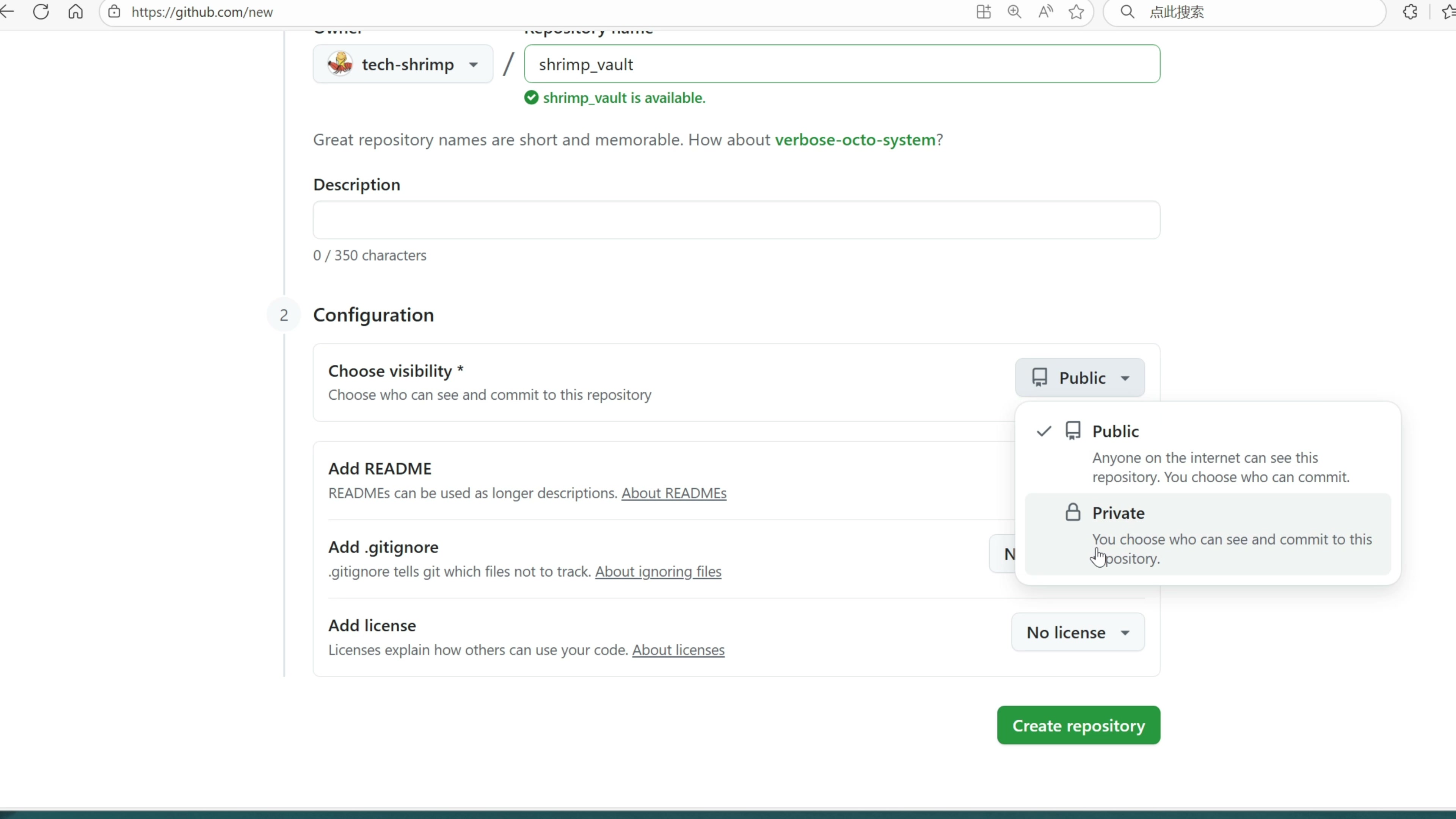 这里我给仓库起个名字,叫 shrimp_vault 。 注意下面的 visibility ,也就是仓库的可见性。 如果你不想把你的笔记公开到互联网上面,这里一定要选择 private ,也就是私有仓库。