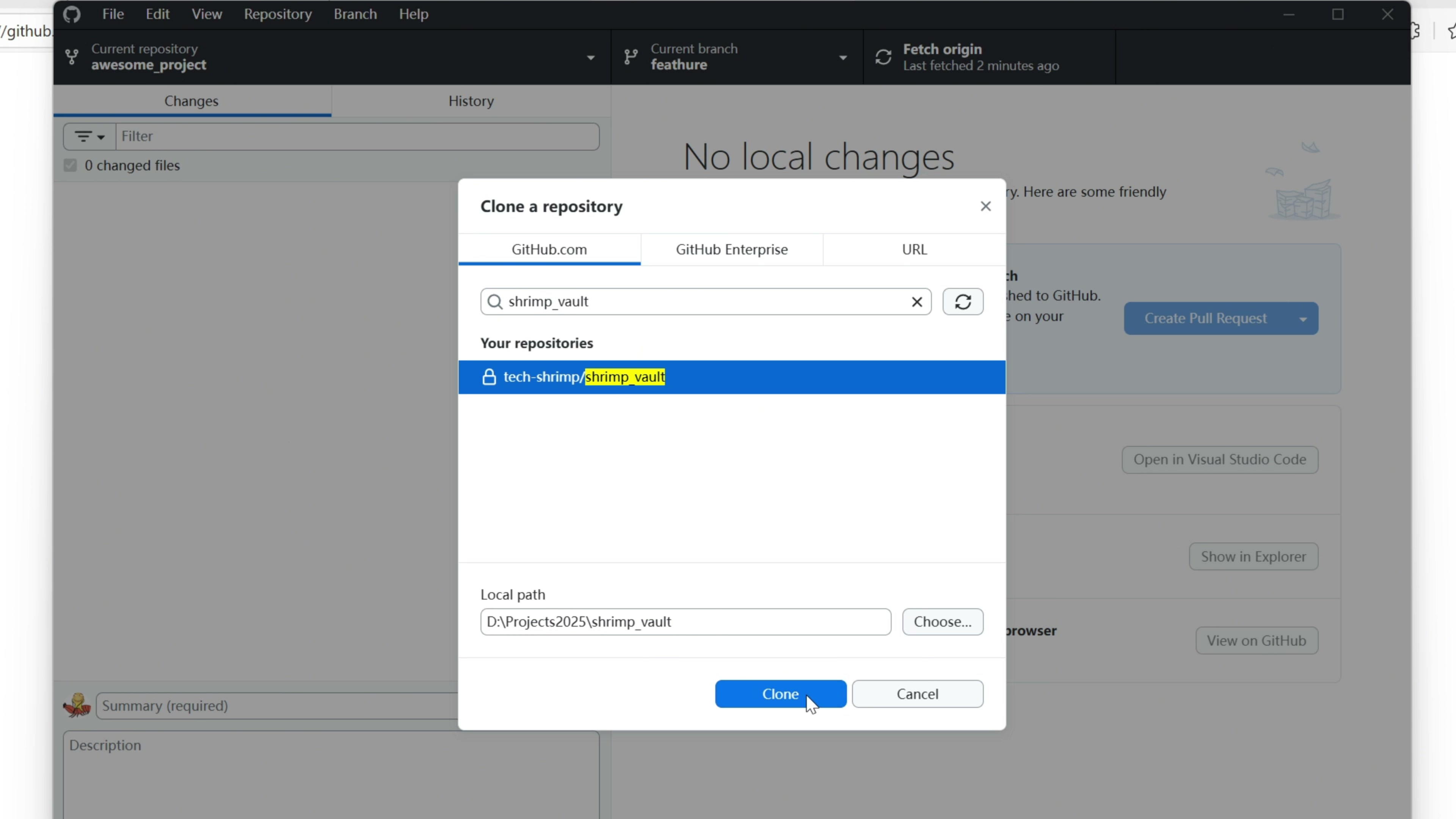 这里需要先登录一下 GitHub 的账号,点击 Sign In 浏览器登录,点击确认。 登录完成以后,就可以搜索到我们的仓库,然后在下面选择一个路径,点击克隆。