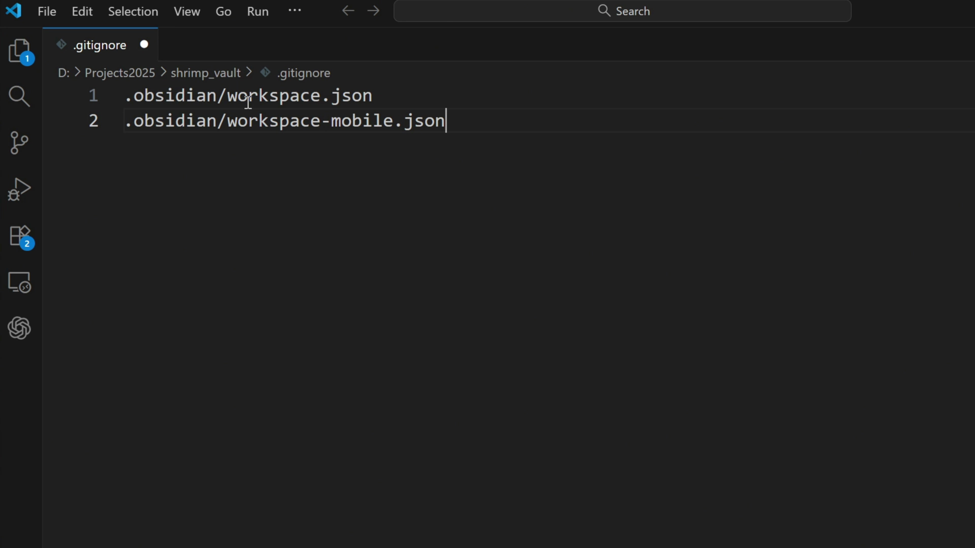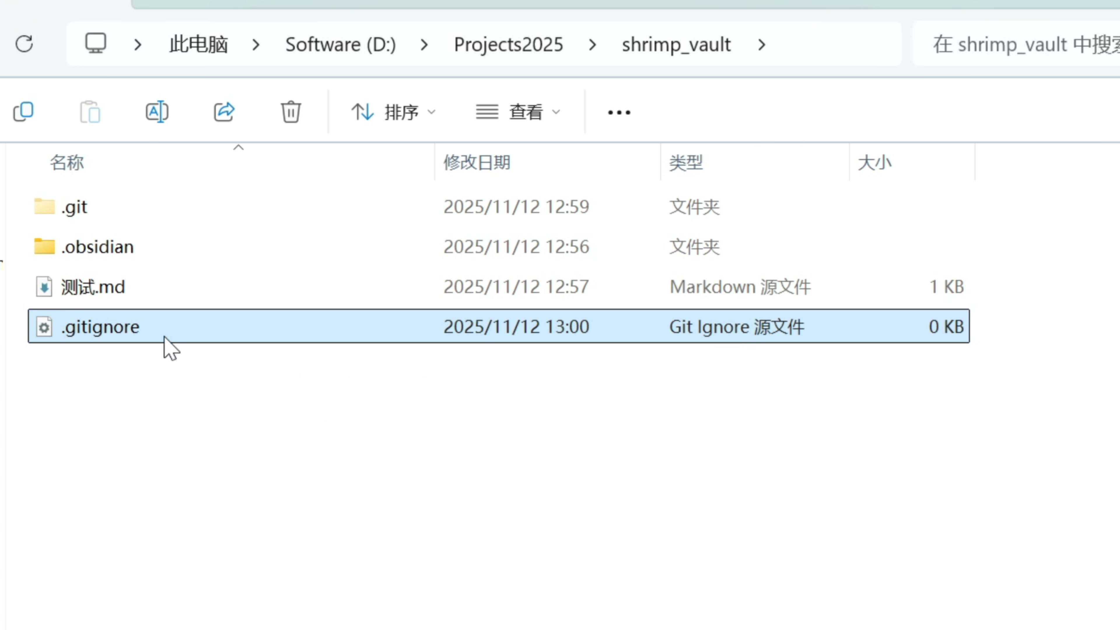 接下来还有一个重要步骤,我们要把这个 workspace.json 从 git 管理的文件里面排除出去,也就是不上传到 Github 上面。这个文件记录了当前工作区的状态,比如打开了哪些笔记,还有当前的页面布局等等。它会被频繁地修改,如果把它上传到 git 上面,很容易造成冲突。这里我们来到仓库的根目录,新建一个文件,文件的名字叫做 .gitignore。