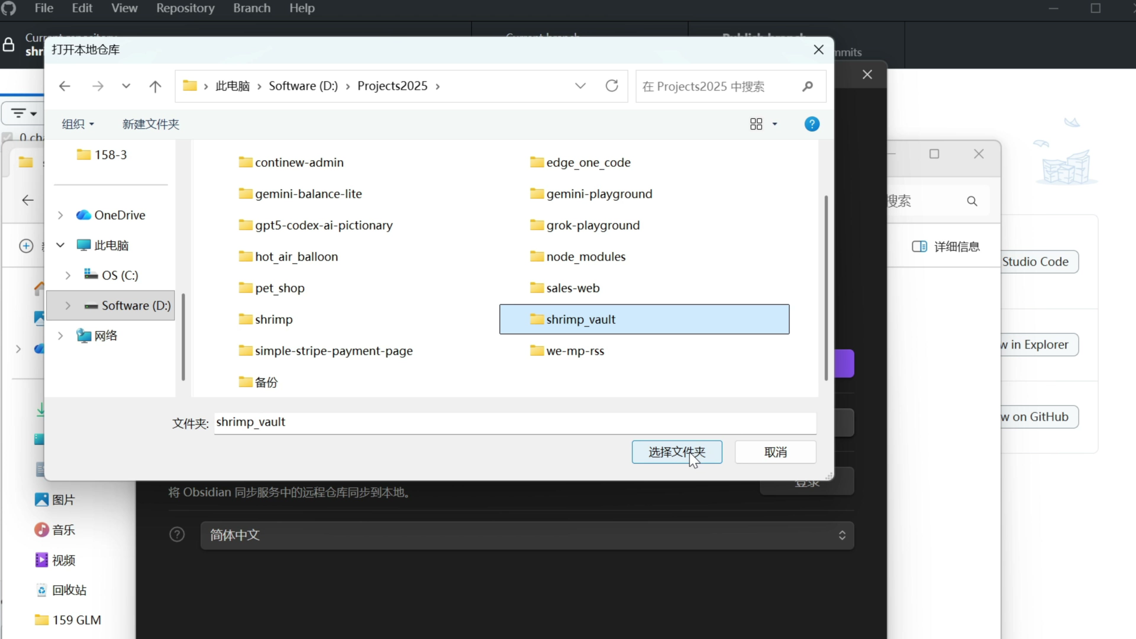 接下来我们打开 Obsidian 软件,选择打开本地仓库,打开,找到克隆下来的本地文件夹,选择文件夹。