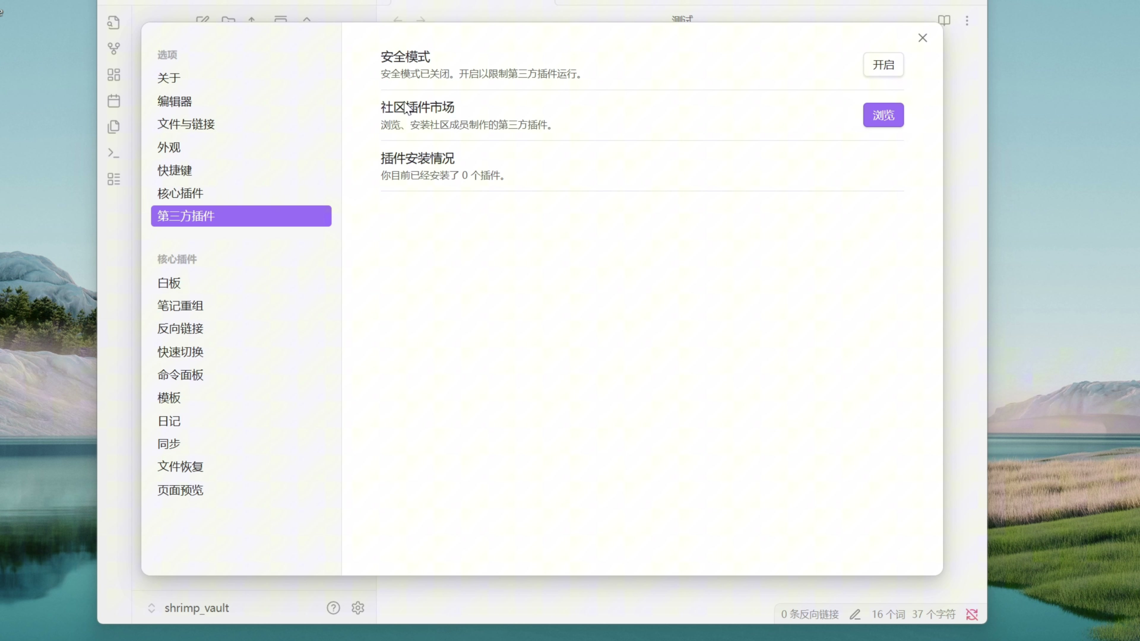 然后再点击 publish 按钮,这样,我们本地的笔记就上传到 GitHub 上面了。 我们来到 GitHub 的网页端看一下,这边同步显示了我们创建的笔记。这样,我们就把我们电脑上的本地笔记库跟 GitHub 做了一个云同步,并且备份到了 GitHub 上面。在我们的这一套操作里面,每次修改完笔记都需要手动提交一次,这么操作下来还是挺麻烦的。我们可以借助一个插件,让 Obsidian 自动化的操作,省去这个手动提交的步骤。我们回到 Obsidian ,找到这个齿轮,也就是设置,选到第三方插件,关闭安全模式。