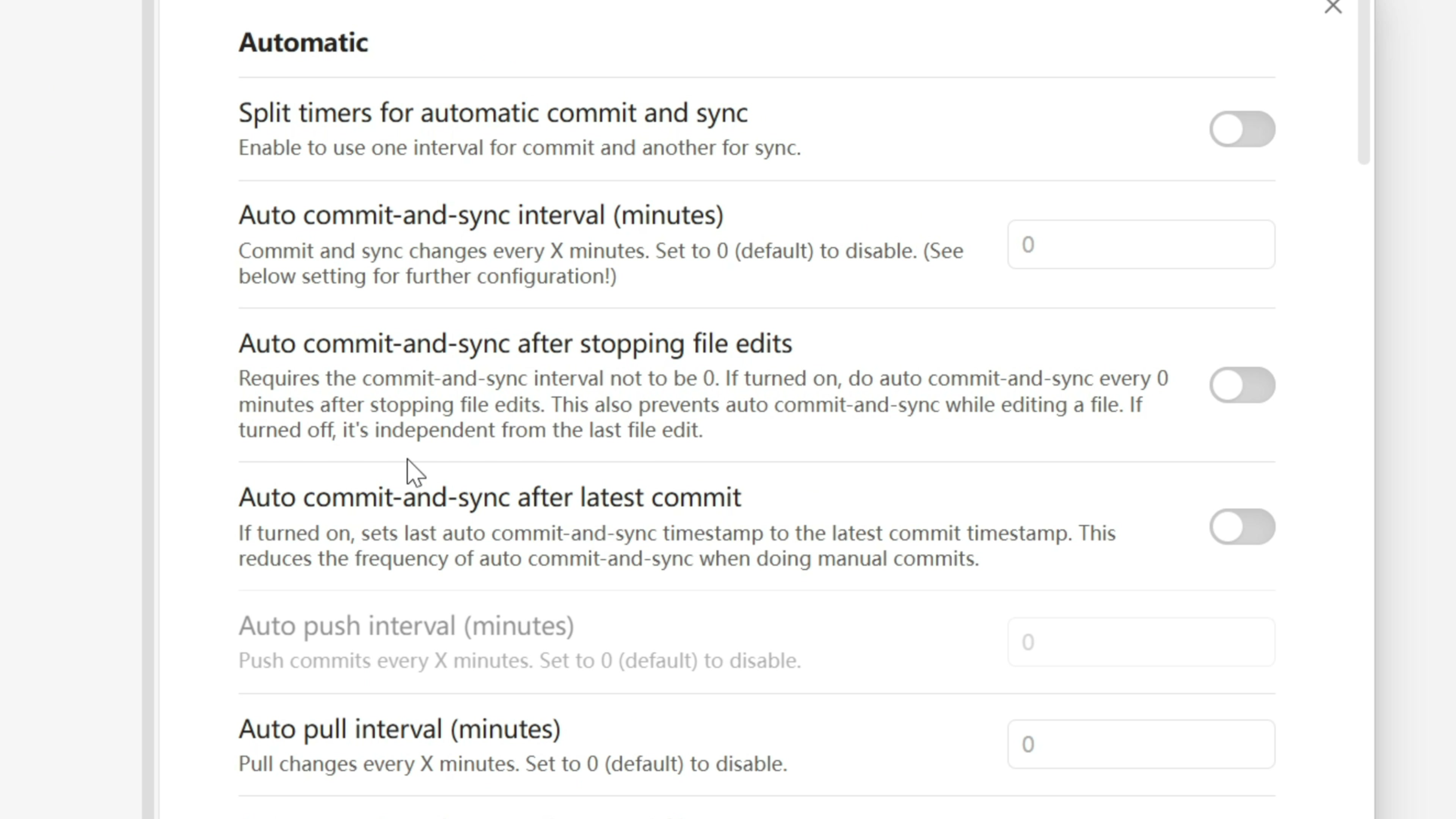 首先是这个 auto commit and sync after stopping file edits,也就是当我们停止编写笔记的时候,他就会尝试自动往 GitHub 上面同步一次。 然后上面的分钟数也需要改一下,这里我改成 1 。 当我们停止编写文件 1 分钟以后,Obsidian 就会自动往 Github 上面提交一次。下面还有一个选项,建议开启,就是这里的 Pull on start 。 每当我们启动 Obsidian 的时候,先去 Github 上面 pull 一下,看看有没有新的改动,保持我们的本地文件跟 Github 上面的同步。