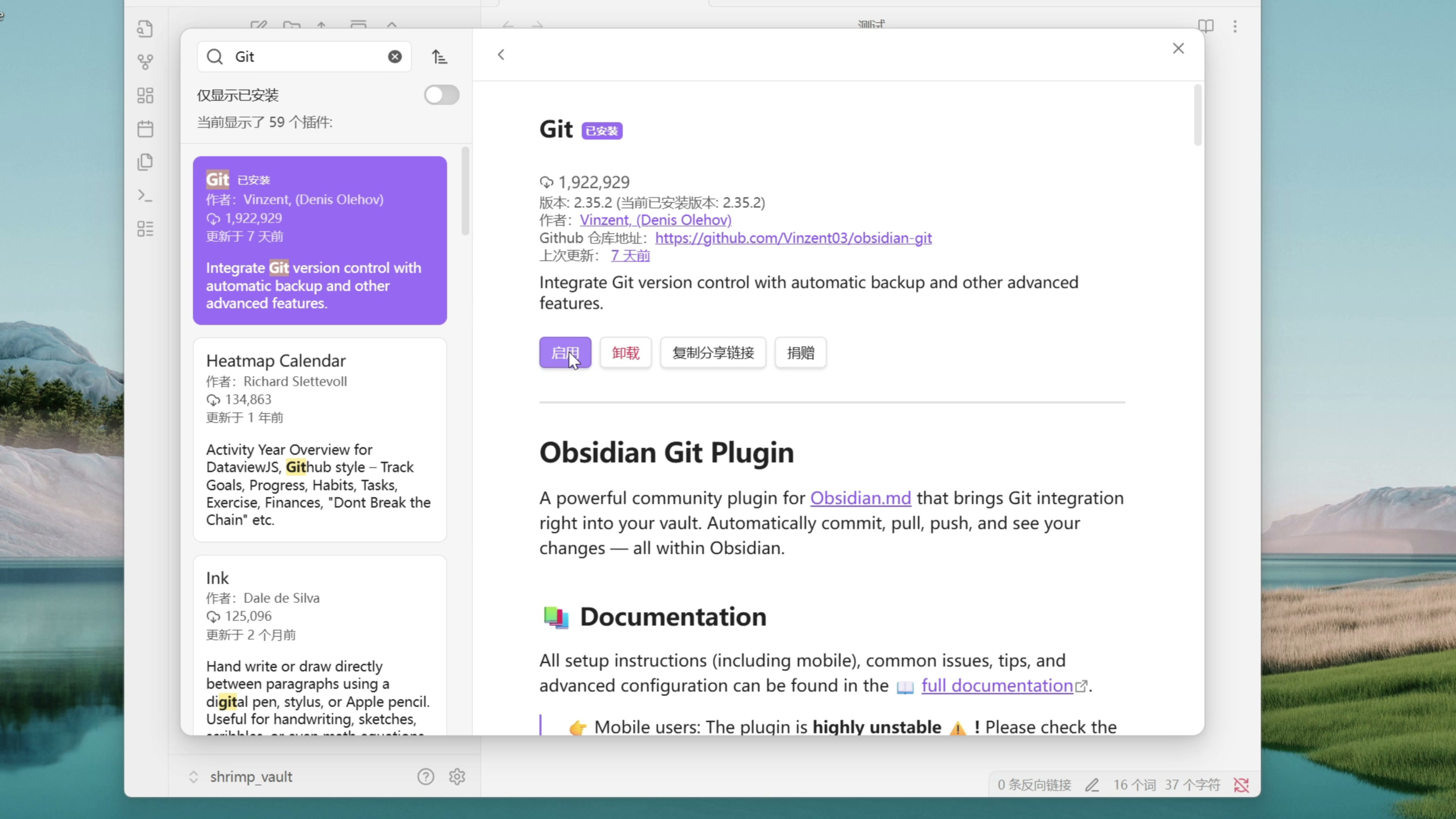然后,我们就可以在社区插件市场里面安装插件。这里我搜索的插件名字就叫做 git ,把这个插件安装一下,然后点击启用。