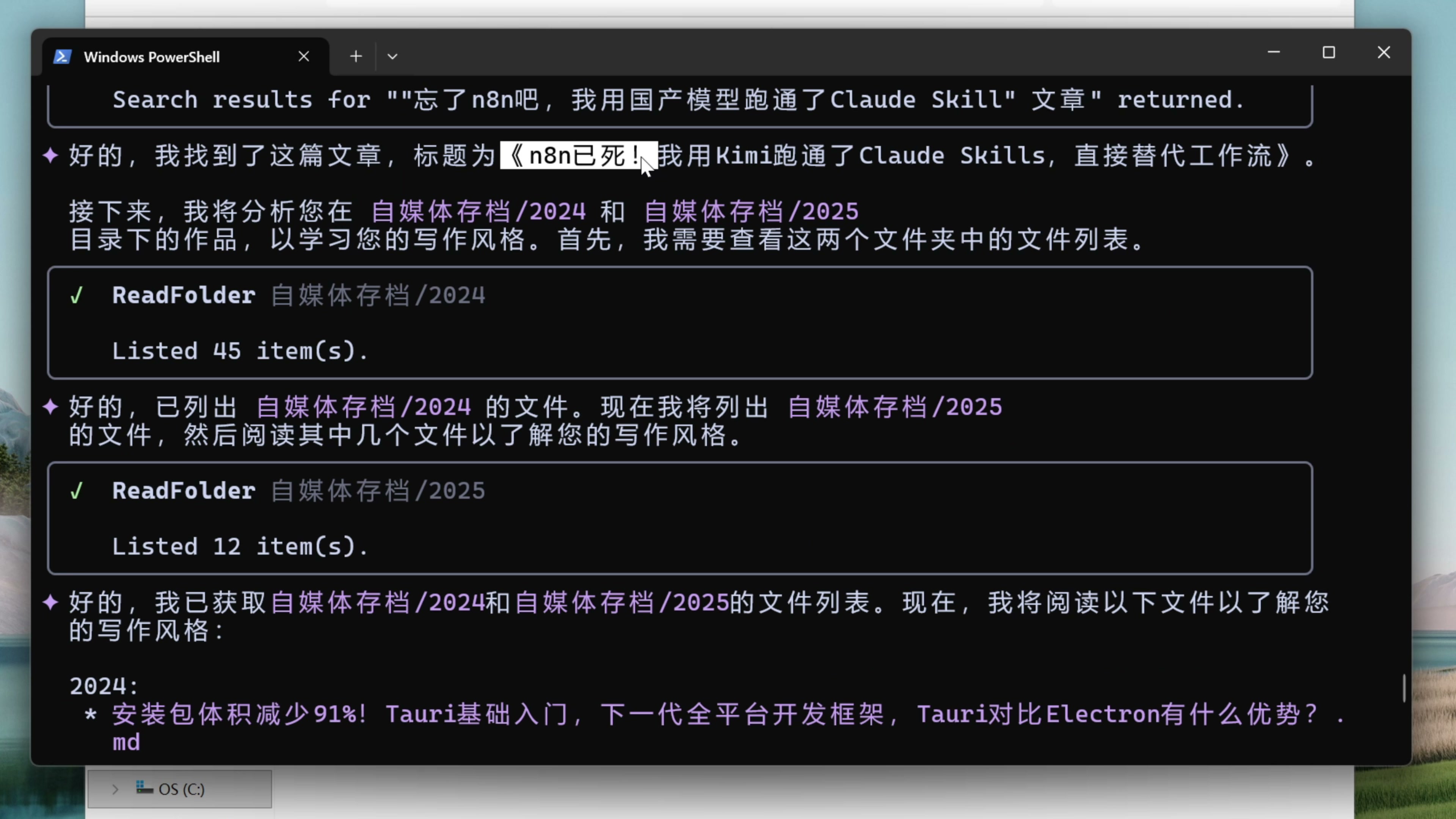 我们再来看一个案例: 我最近看到一篇文章叫做《忘了 n8n 吧,我用国产模型跑通了 Claude Skill 》,这个文章很不错。你搜索下文章的内容,然后根据我的行文风格写一个视频脚本,需要详细一些,脚本放到根目录即可。行文风格可以参考我 2024 年与 2025 年的往期内容。