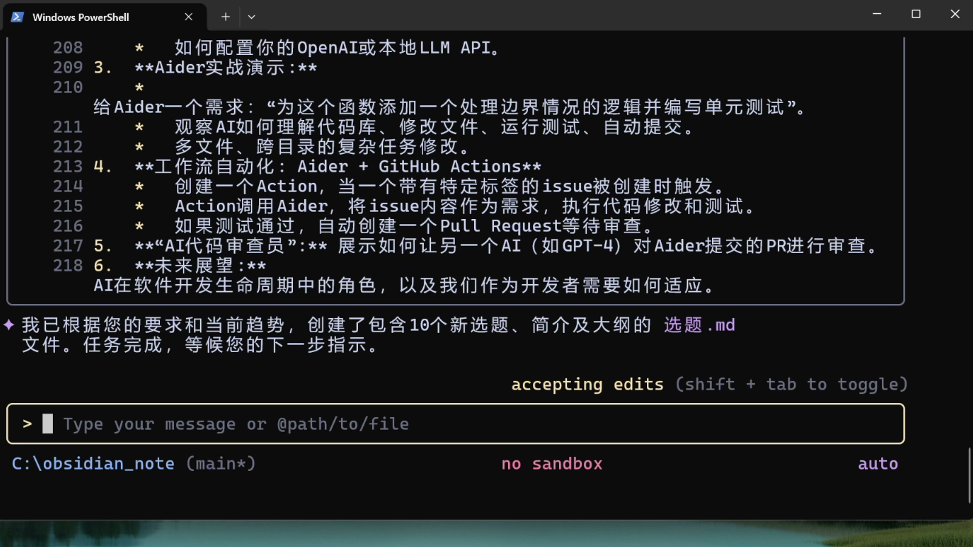 我们来看第一个案例: > 自媒体存档这个文件夹里面存的是我这三年写过的所有视频的脚本,请根据我的选题特色与观众喜好,调用网络搜索工具来搜索热点,用你丰富的知识,探寻我没有做过的选题,帮我再写 10 个选题。你输出一个《选题.md 》文件放到当前项目的根目录下面,每个选题都应该有对应的简介与大纲。