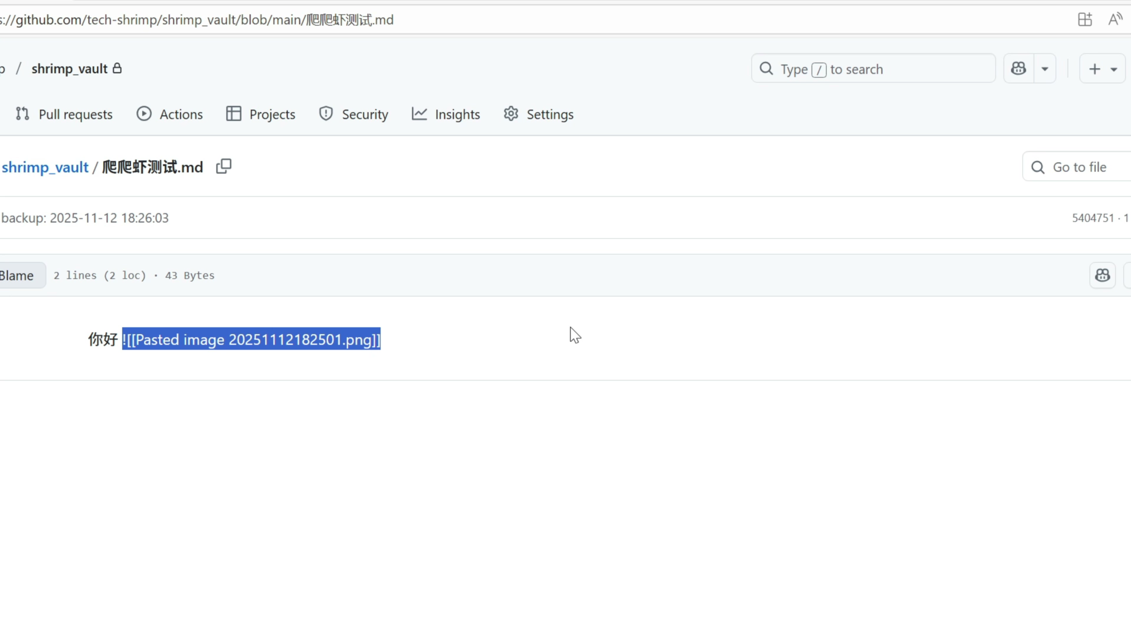 这样图片一多,整个目录文件夹都会变得很乱。第二个问题是,他这里的图片链接,并不是标准的 Markdown 语法,不能使用别的软件读取。 我们来看一下,这里正好它已经自动同步到 GitHub 上面了,图片插入的不是标准的 Markdown 格式,所以在 GitHub 的网页端,没法对这个图片成功地显示出来。