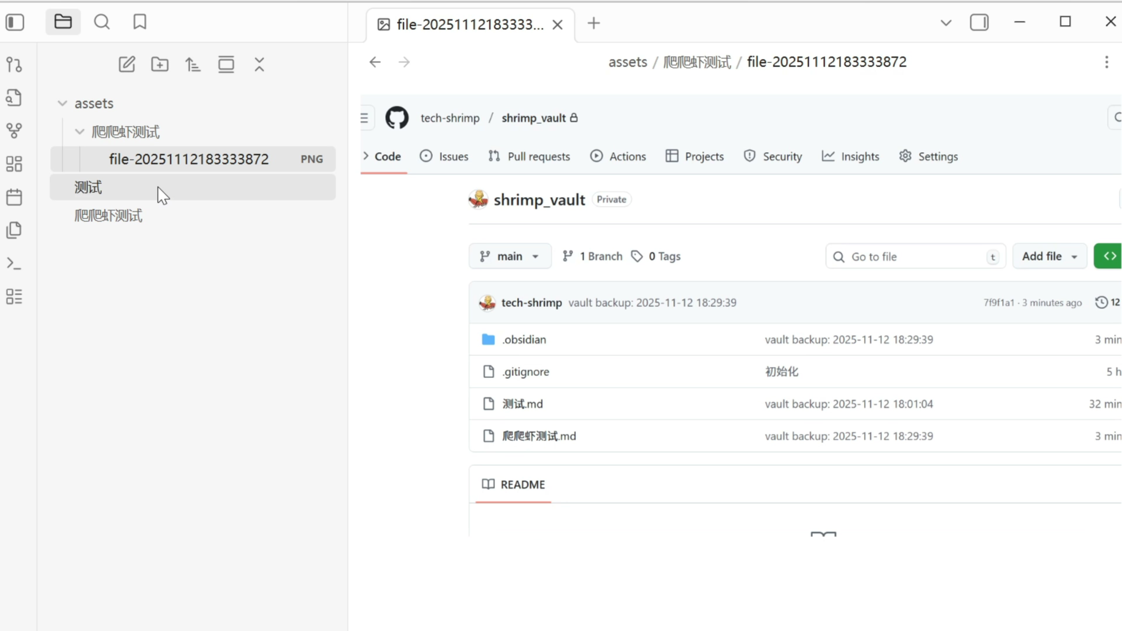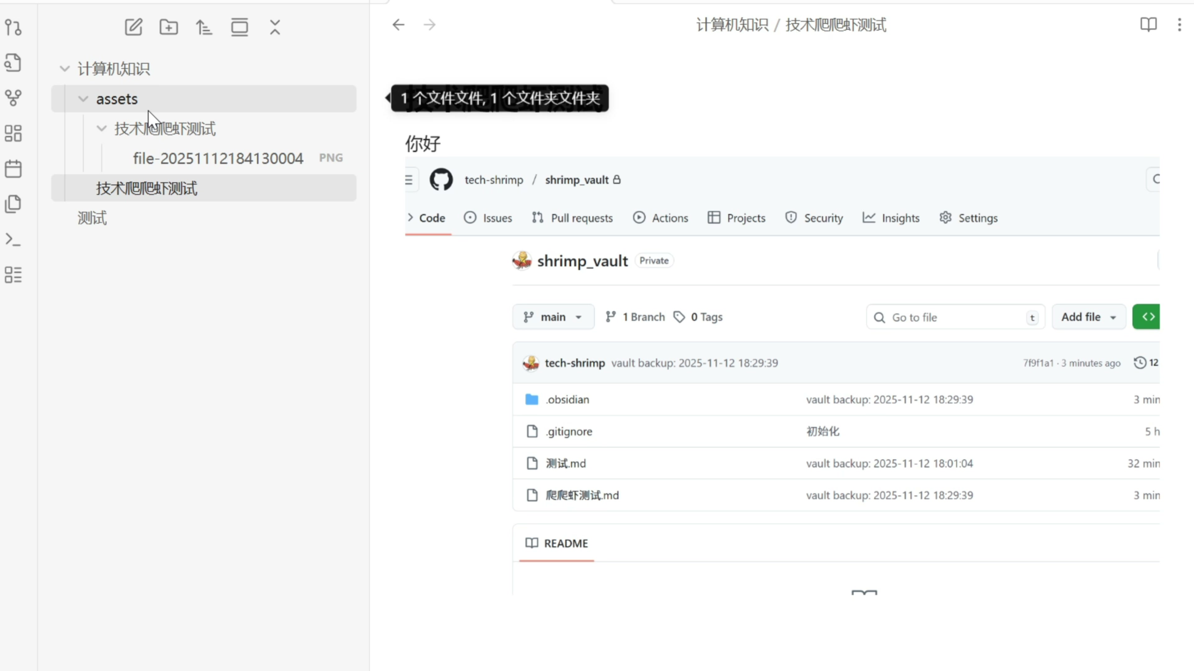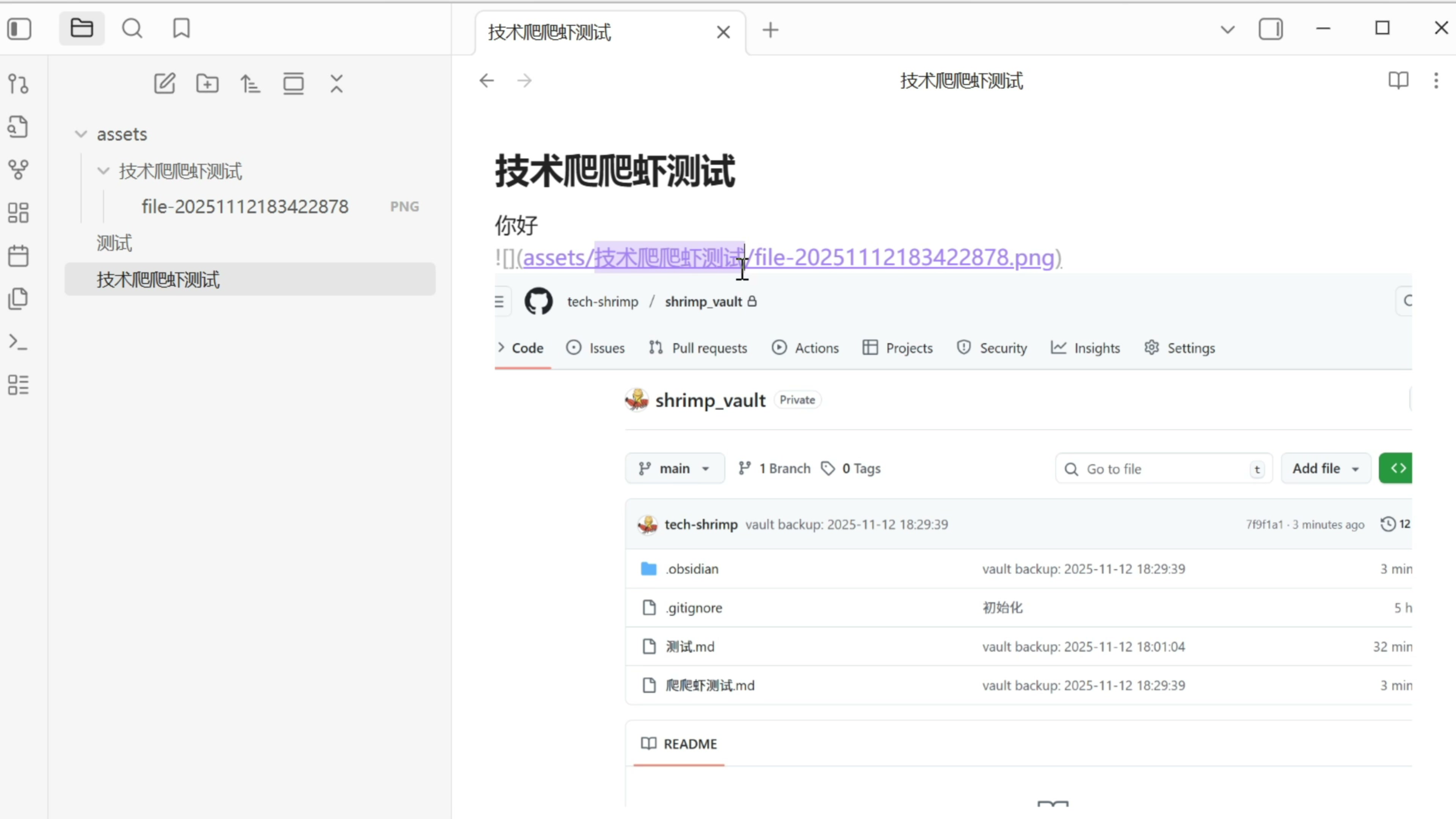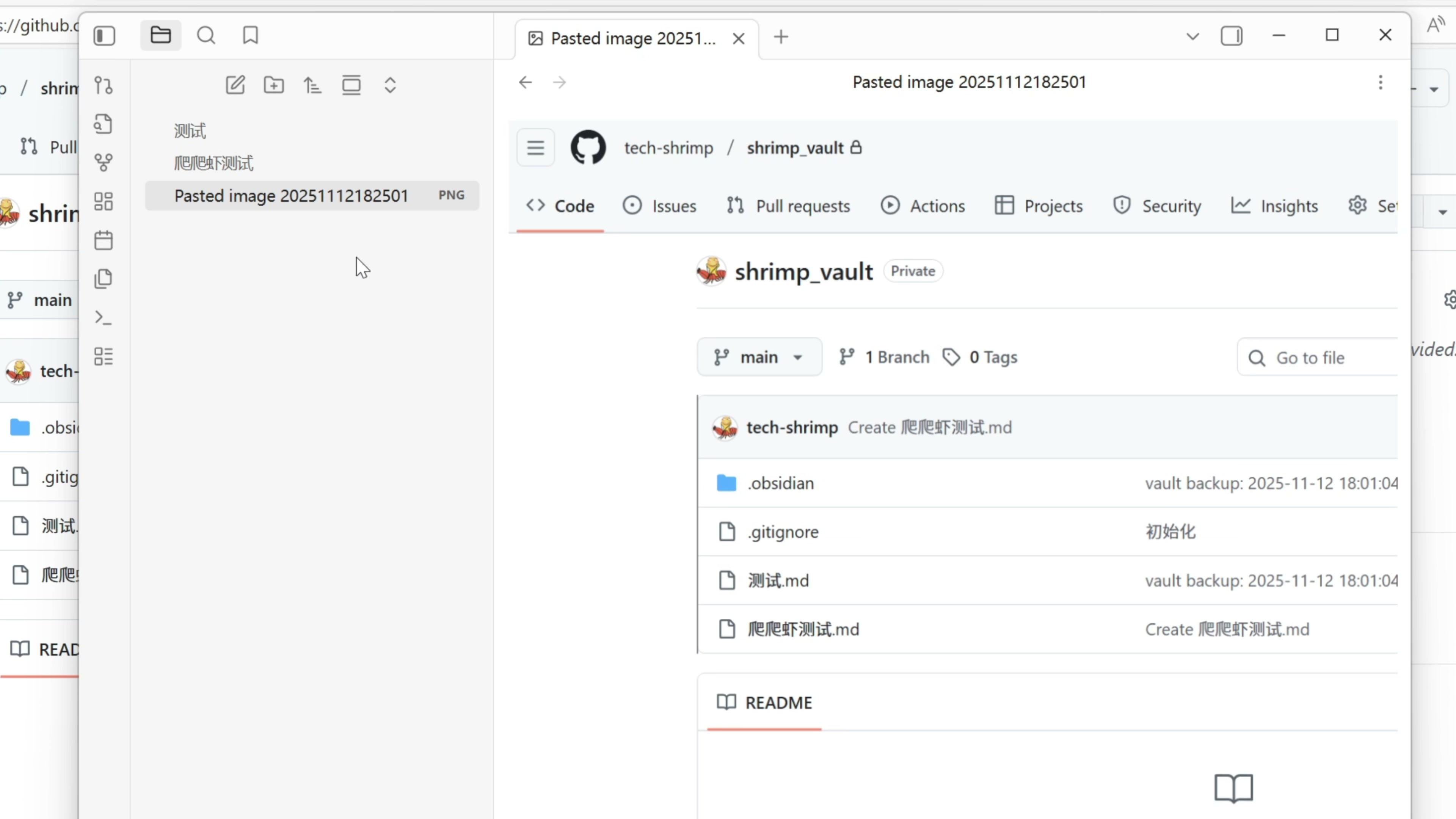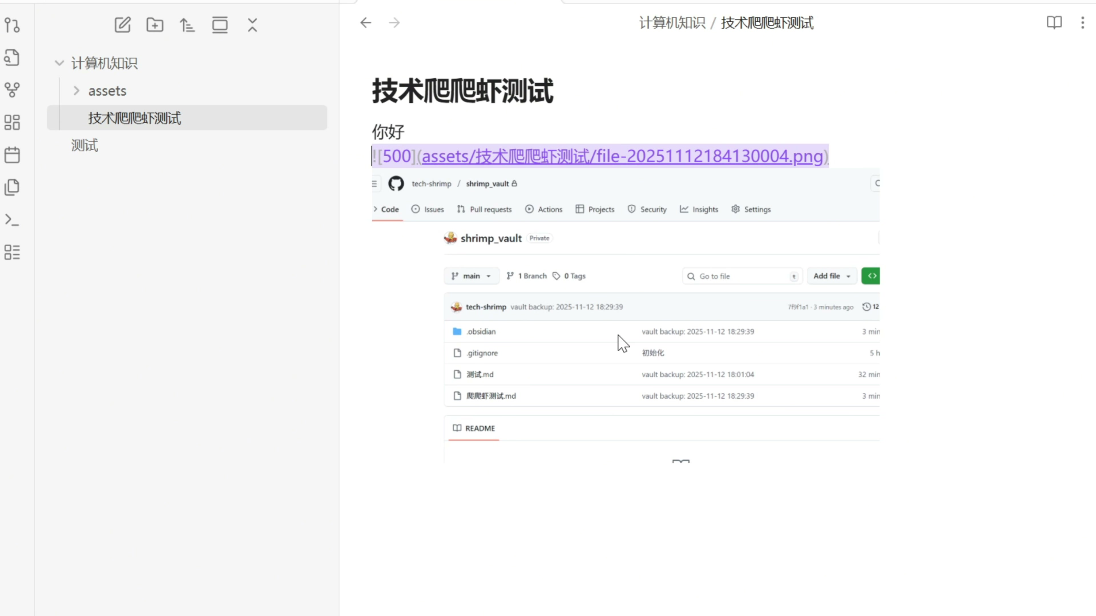 Obsidian 本身是有图片存储功能的,但是我觉得它并不好用。我们来测试一下,这里我给 GitHub 仓库截一张图,然后我们来到 Obsidian 粘贴上。 我们看到,他把图片放到了跟笔记同级别的一个目录下面。