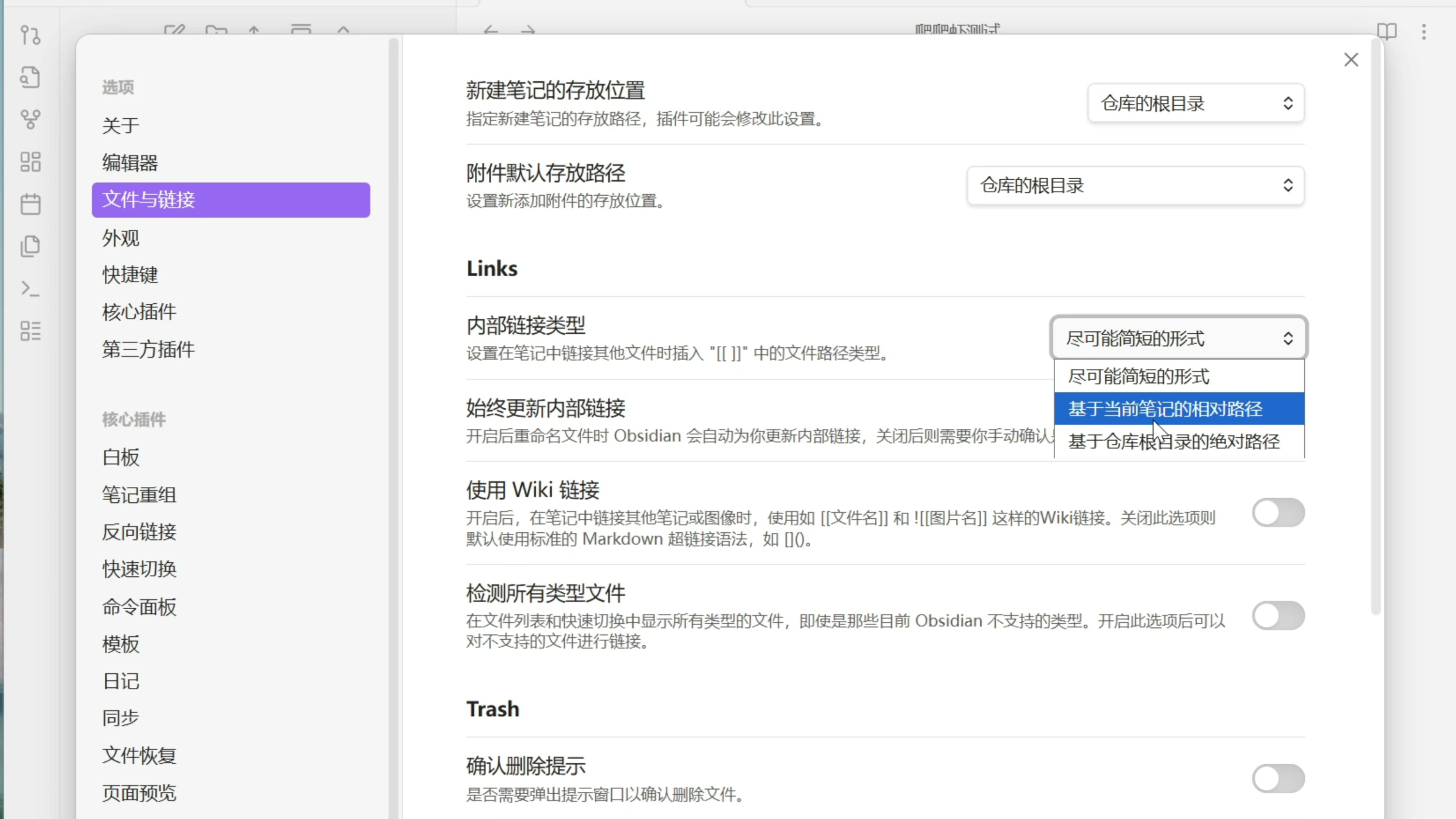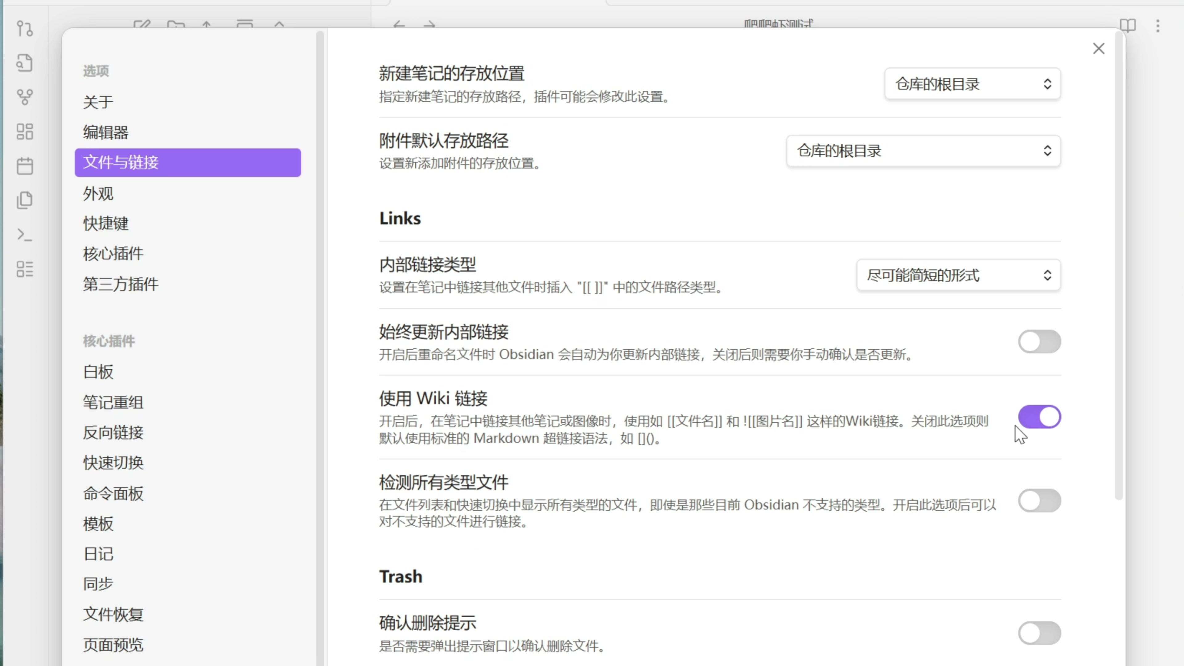 然后我们再来到 Obsidian 的设置,找到系统设置里面的文件与链接,注意把这个“使用 Wiki 链接”取消掉。