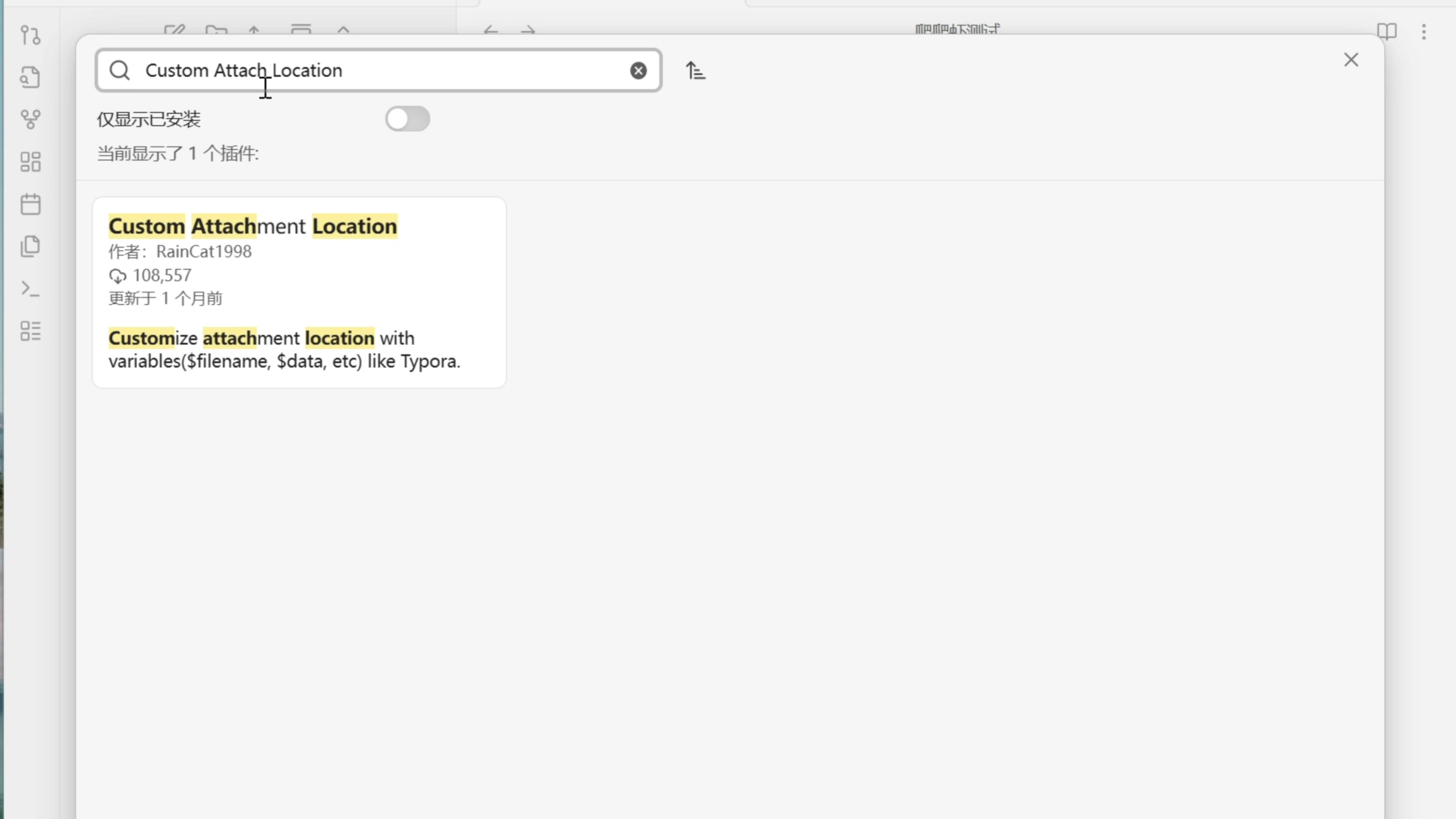 这里我要借助一个插件,把我们的图片格式,标准成一个 Markdown 的语法。我先把原来的图片都删除掉。然后我们找到设置,还是第三方插件,社区插件市场,浏览,我们搜索这个插件 Custom attach location ,也就是自定义附件存储位置。