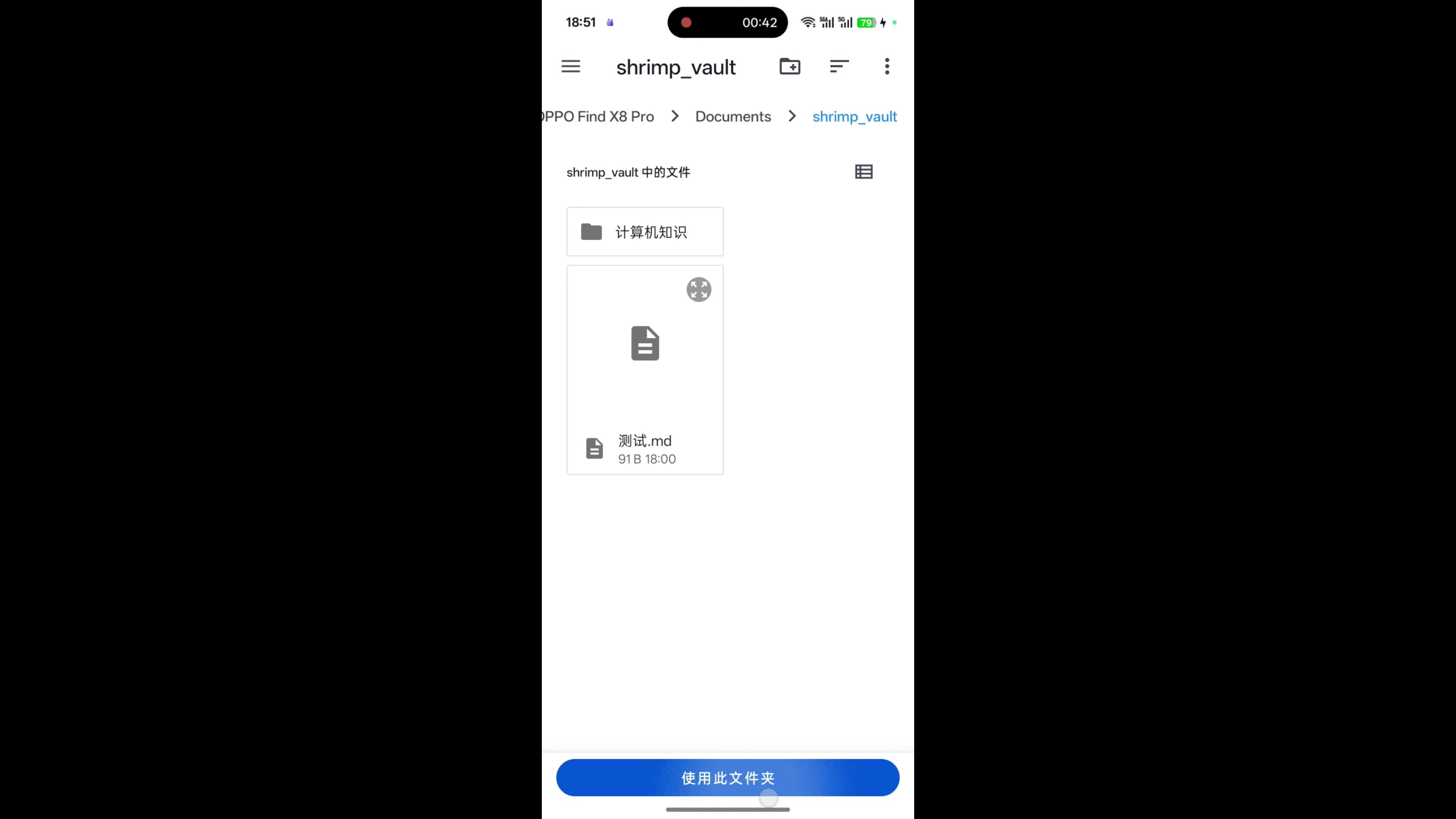 接下来的操作我们需要在手机上进行。这里打开手机上的 Obsidian ,点选择 Open Folder as vault ,选择我们复制进来的文件夹,点击“使用此文件夹”,允许。