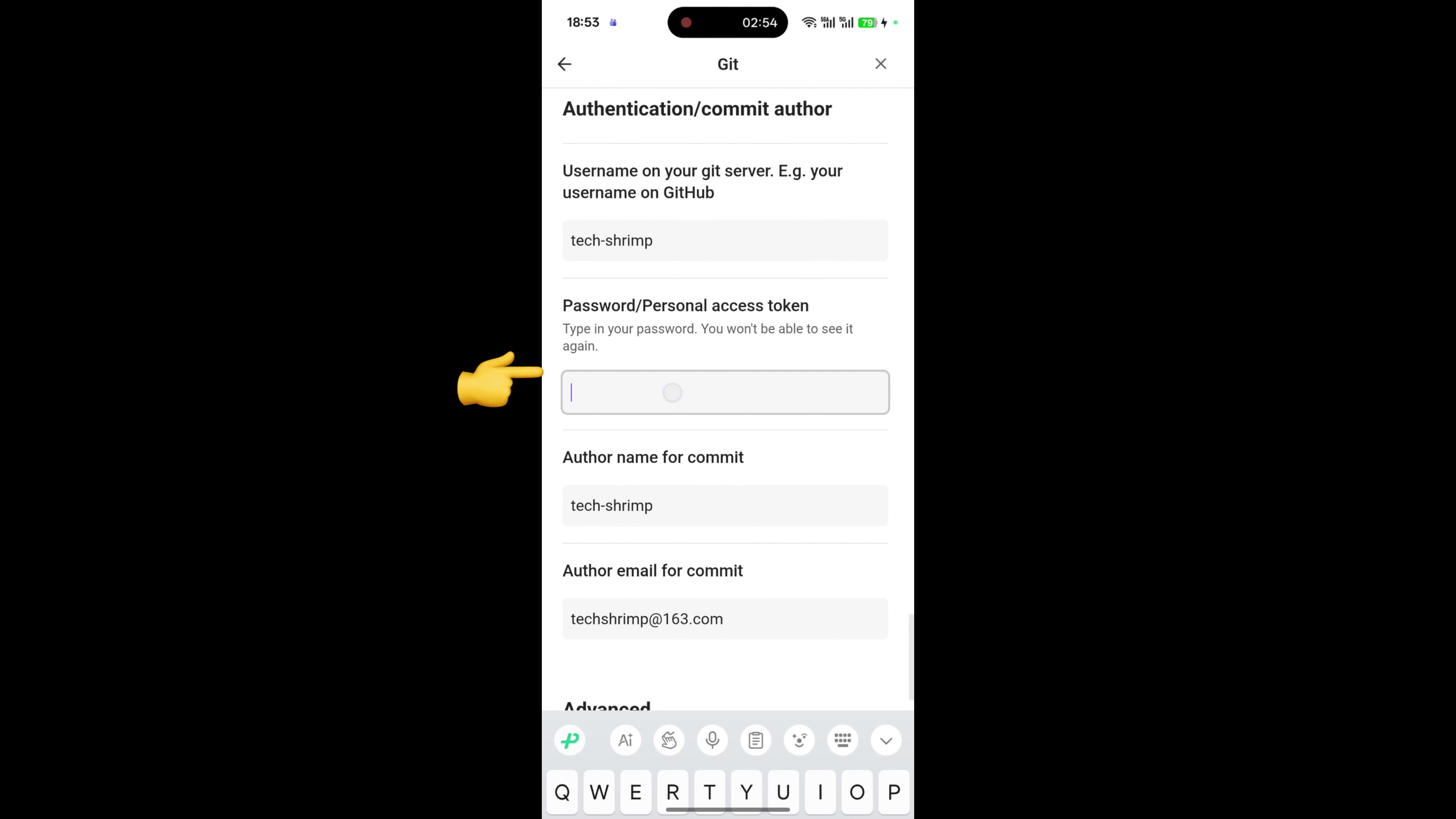 填写好英文名字,把它复制一下,下面也填写一下英文名字。然后填写你在 GitHub 上面的注册邮箱。最后要填写的,就是我们在 GitHub 上面的 Personal access token 。