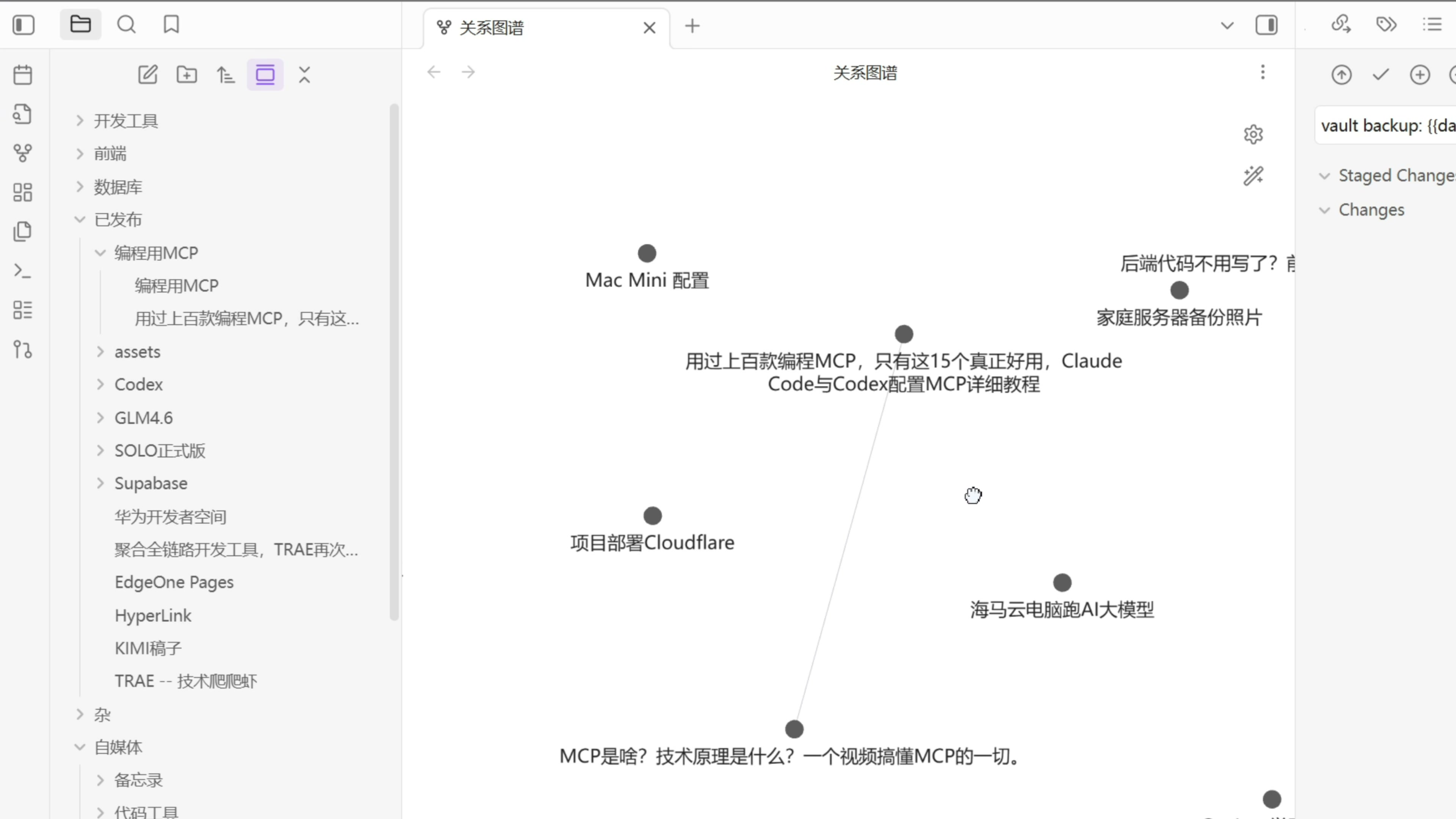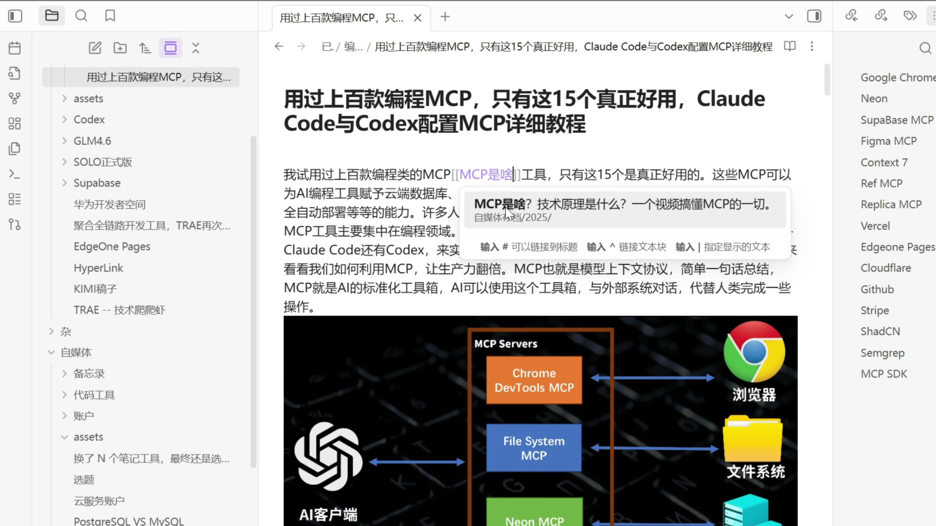 Obsidian 另外一个强大的功能,就是它的双向链接与知识图谱。比如我们看这篇笔记:“我试用过上百款编程类的 MCP 工具”,在 MCP 这里我可以输入两对方括号,然后可以在这里面搜索另外一个笔记的标题。
