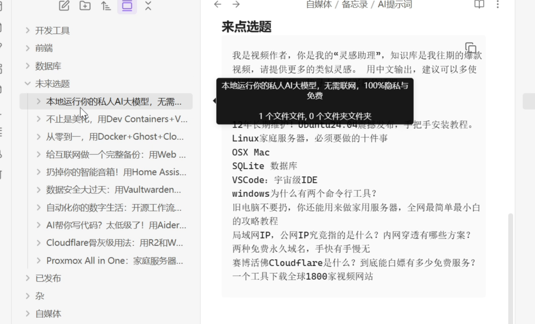我们再来看一个例子: 你把这 10 个选题建出子文件夹,所有的子文件夹都放到根目录/未来选题这个里面。每个子文件夹里面都有一份选题大纲文件。做完以上工作,就把根目录的《选题.md 》这个删除掉。