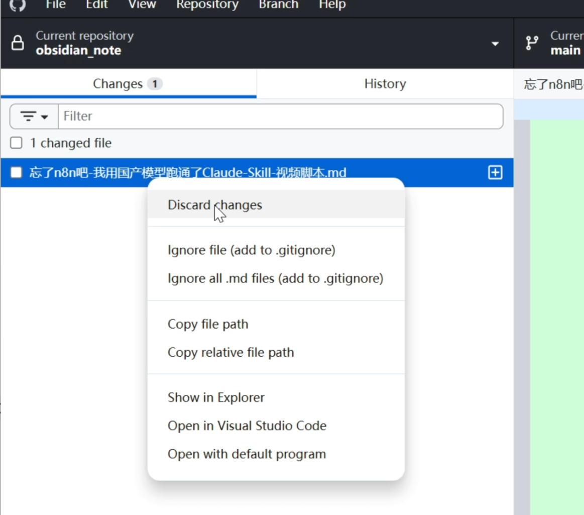 如果你担心 AI 把你的文件夹搞乱,把一些重要的文件搞丢,其实这个也不用担心。我们使用 git 把每一次的文件修改,其实都已经记录下来了。如果你对 AI 的修改不满意,我们可以直接右键选择 discard changes ,直接把仓库的状态还原到 AI 的修改之前。