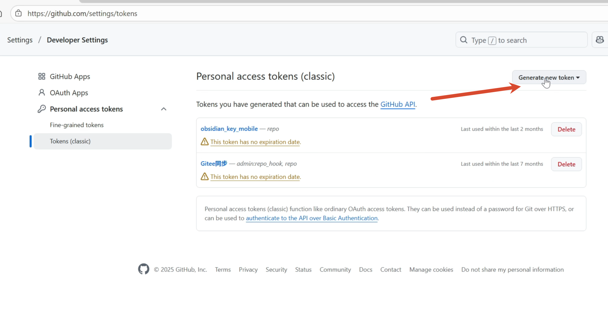 我们回到电脑端 Github ,右上角找到 Settings ,在下面有一个 Developer Settings ,这里找到 Personal access tokens (classic),创建一个新的 TOKEN ,选择创建 classic 。