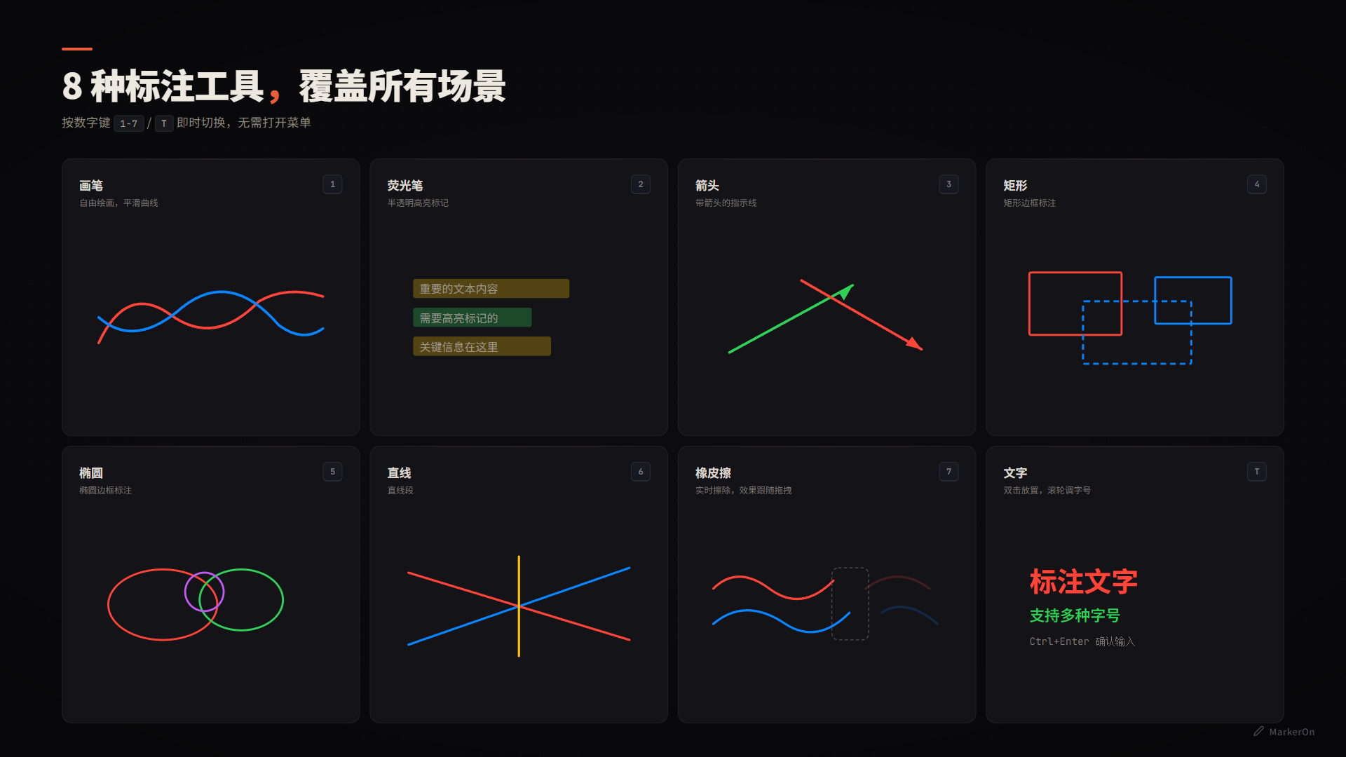 画笔、荧光笔、箭头、矩形、椭圆、直线、橡皮擦、文字 —— 按数字键 1-7 / T 即时切换,无需打开菜单。