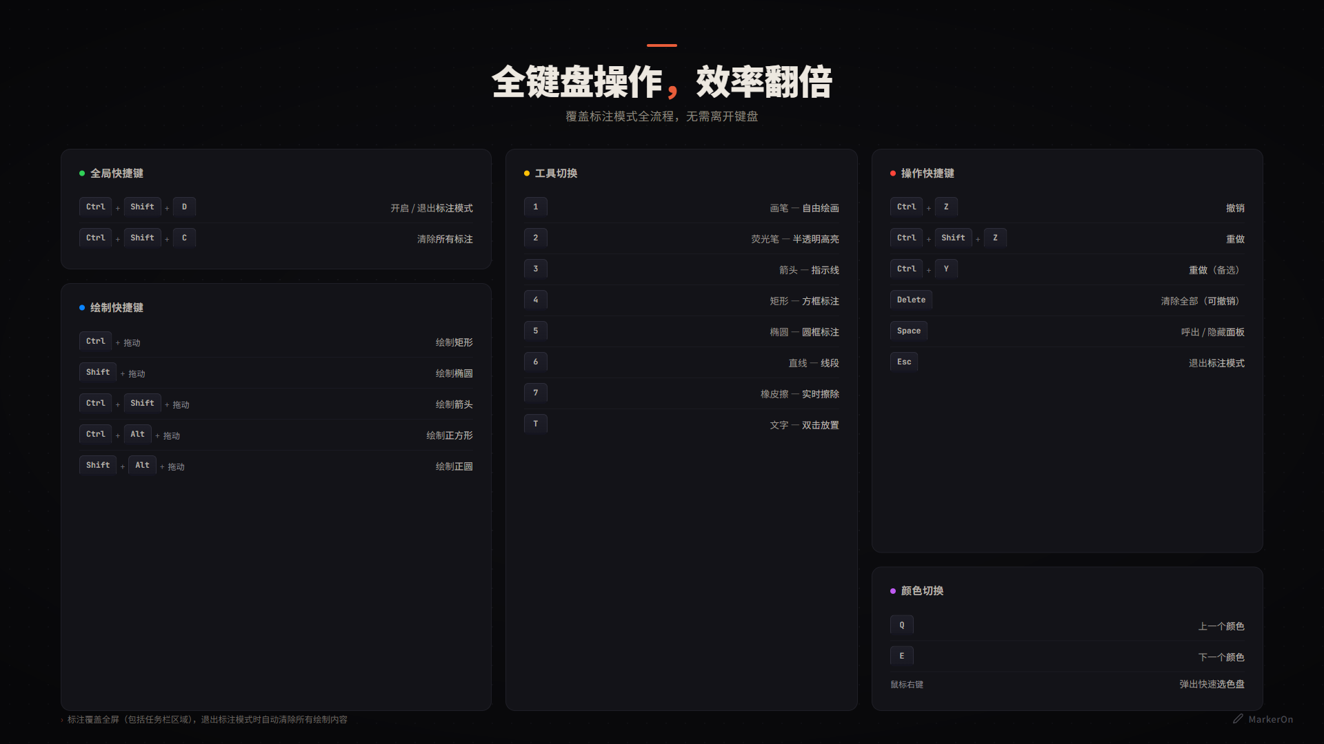 从进入标注到选工具、换颜色、撤销重做,全程不需要离开键盘。完整快捷键支持: