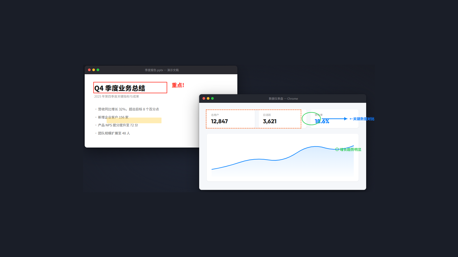 全屏透明覆盖层,在任何应用上面直接画。Esc 退出,标注自动清除,不留痕迹。