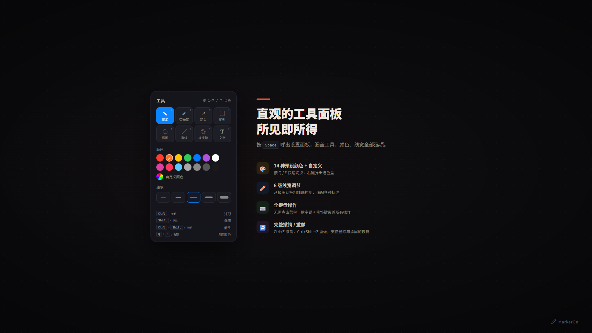 • 14 种预设颜色 + 自定义色,按 Q/E 快速切换,右键弹出选色盘