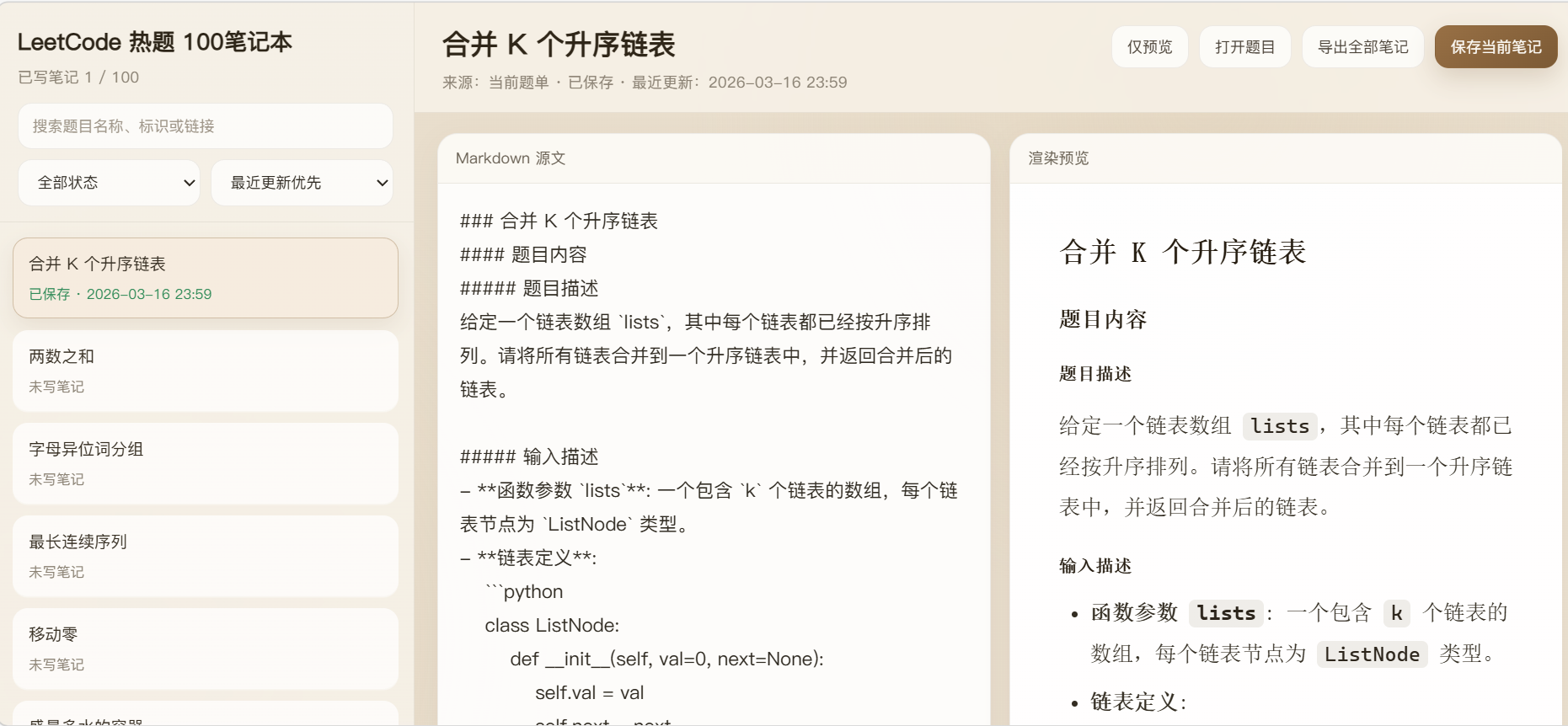 这个功能是我自己最常用的。在 LeetCode 页面里,插件会把题目内容、你的代码、参考题解整理出来,然后生成一份结构化的 Markdown 笔记。笔记界面的 UI 我也专门打磨了一下,整体参考了 Claude 那种简洁的阅读体验。这样一道题刷完之后,留下的就不只是一个干瘪的 AC 记录,而是一份排版赏心悦目的复盘笔记,后续回顾思路也一目了然。