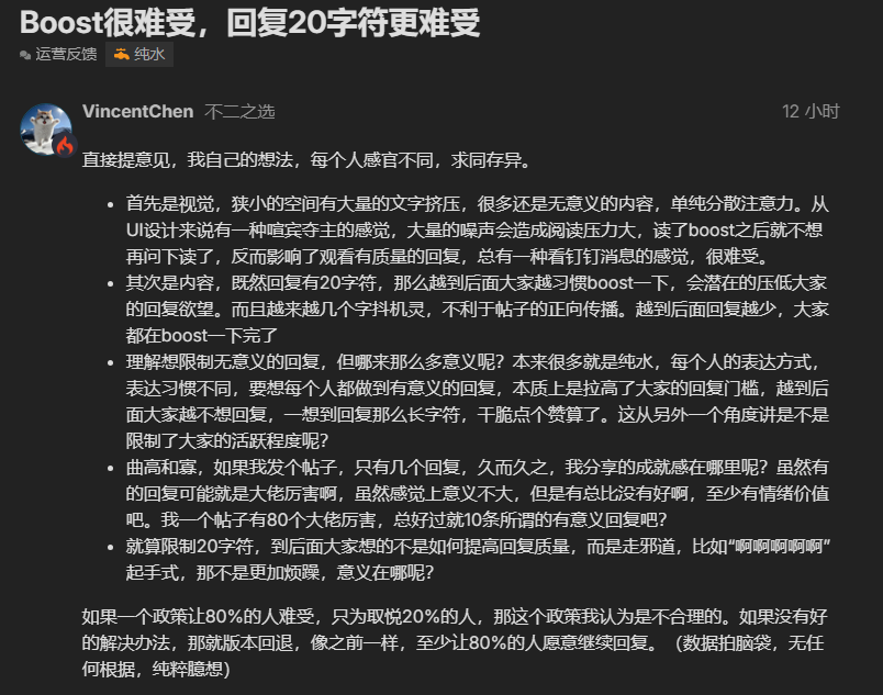 我就在下面跟着评论了,大概的含义就是说,人家X,WB,抖音,都没有这限制,你做这个限制不是为了牺牲大多数人利益,满足自己的爽感吗?