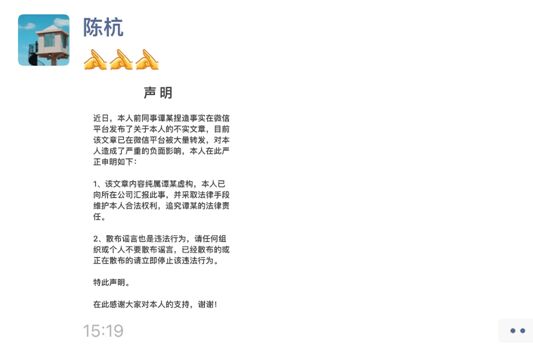同时,记者也注意到,在4月7日15时19分,陈杭已在其朋友圈发布声明。